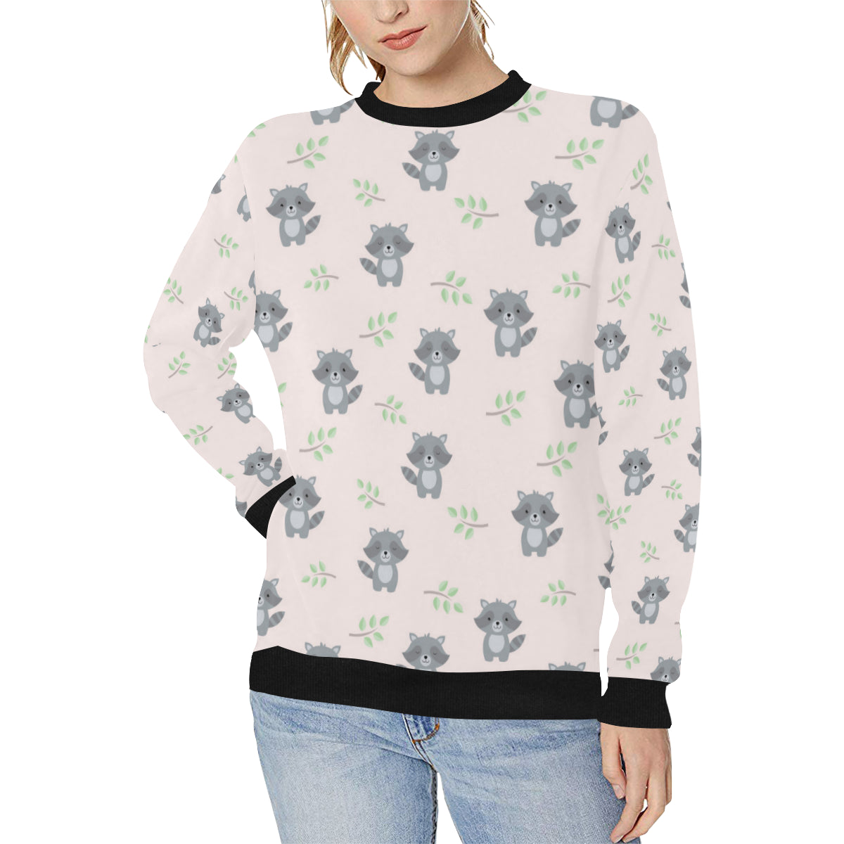 cute raccoons leaves pattern Women's Crew Neck Sweatshirt is a uniqued design and limited item. It made to order, hand printed, and sewn with love in our factory.