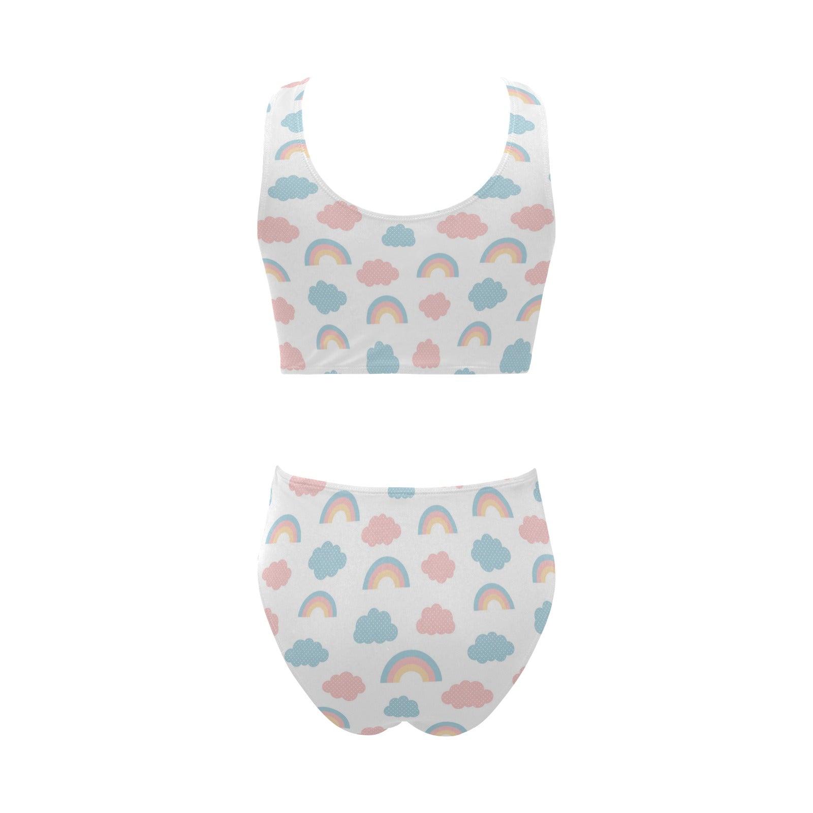 Cute rainbow clound pattern Chest Bowknot High Waisted Bikini Swimsuit