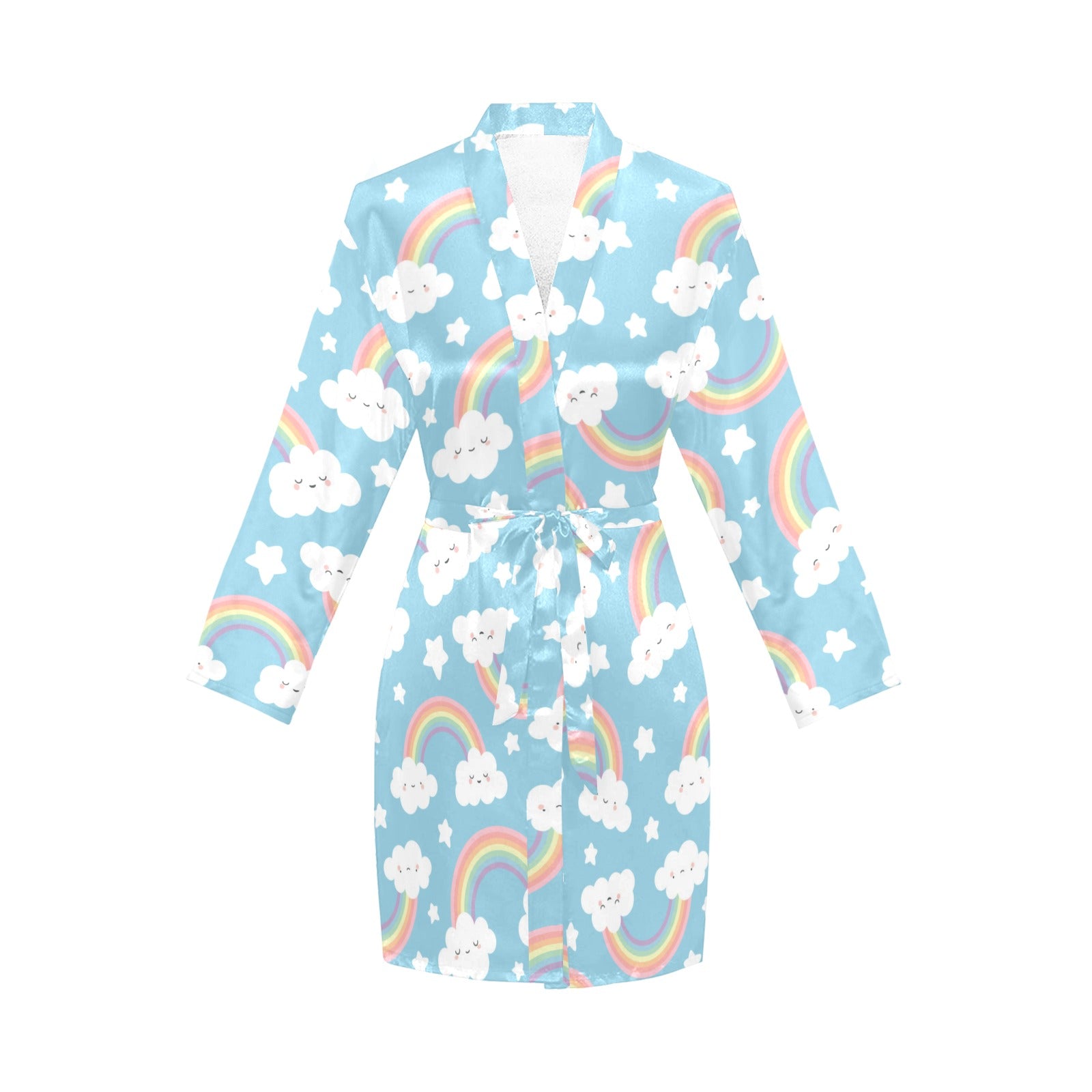 Cute rainbow clound star pattern blue background Women's Long Sleeve Belted Night Robe