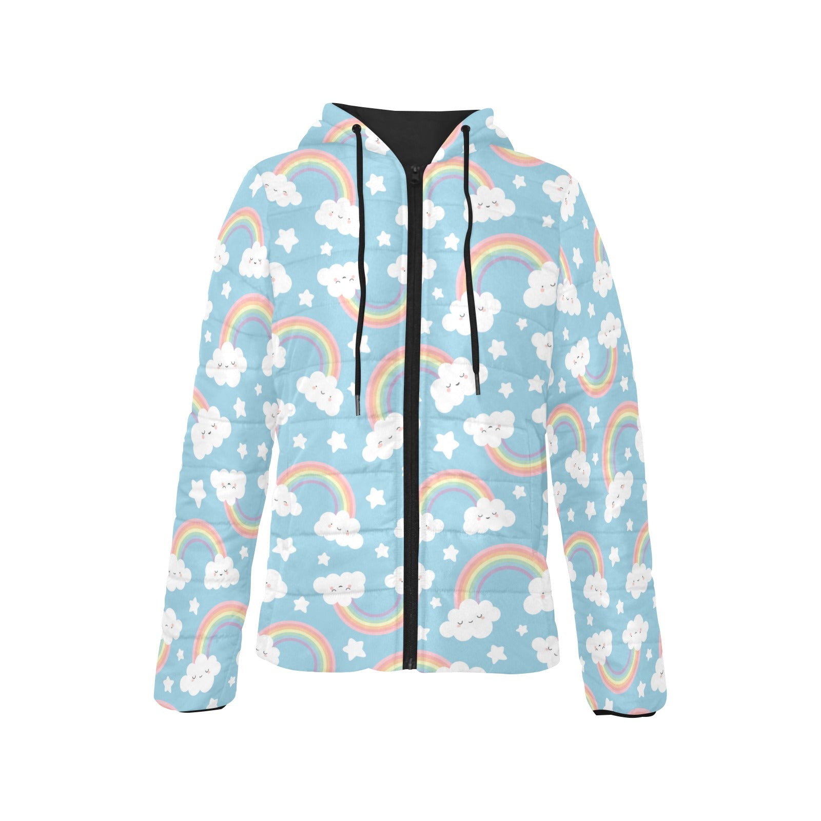 Cute rainbow clound star pattern blue background Women's Padded Hooded Jacket