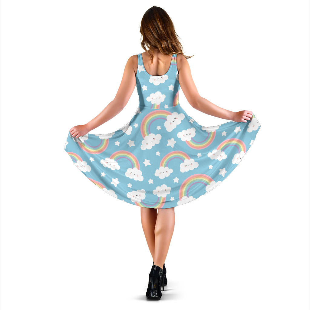 Cute rainbow clound star pattern blue background Sleeveless Midi Dress is a uniqued design and limited item. It made to order, hand printed, and sewn with love in our factory.