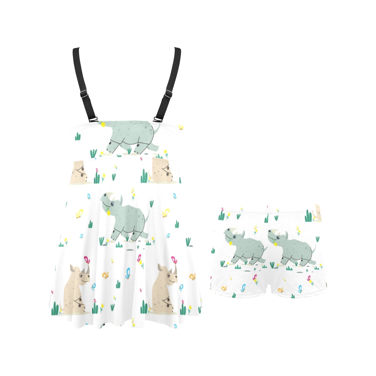 Cute Rhino pattern Chest Sexy Pleated Two Piece Swim Dress