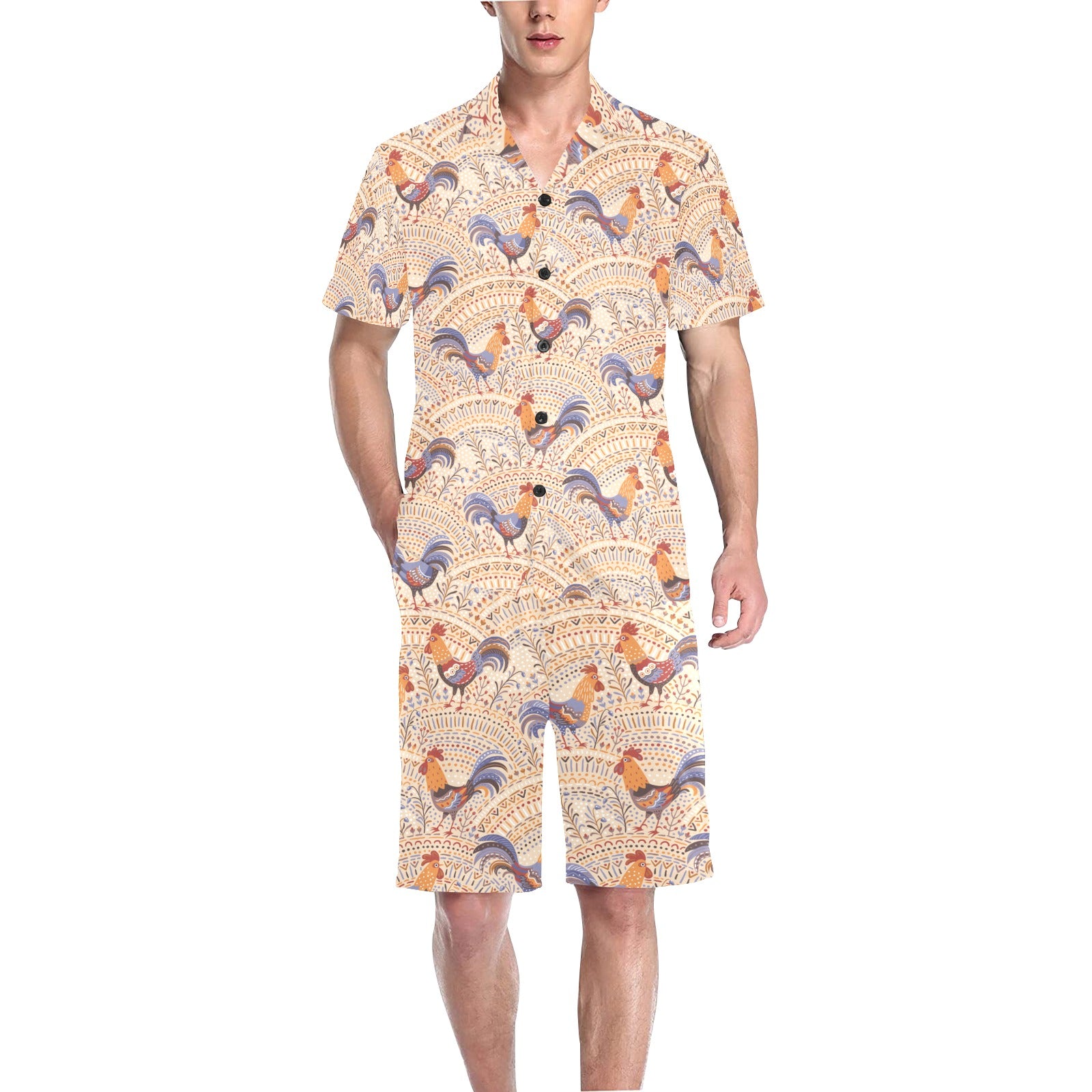 Cute rooster chicken cock floral ornament backgrou Men's V-Neck Short Pajama Set