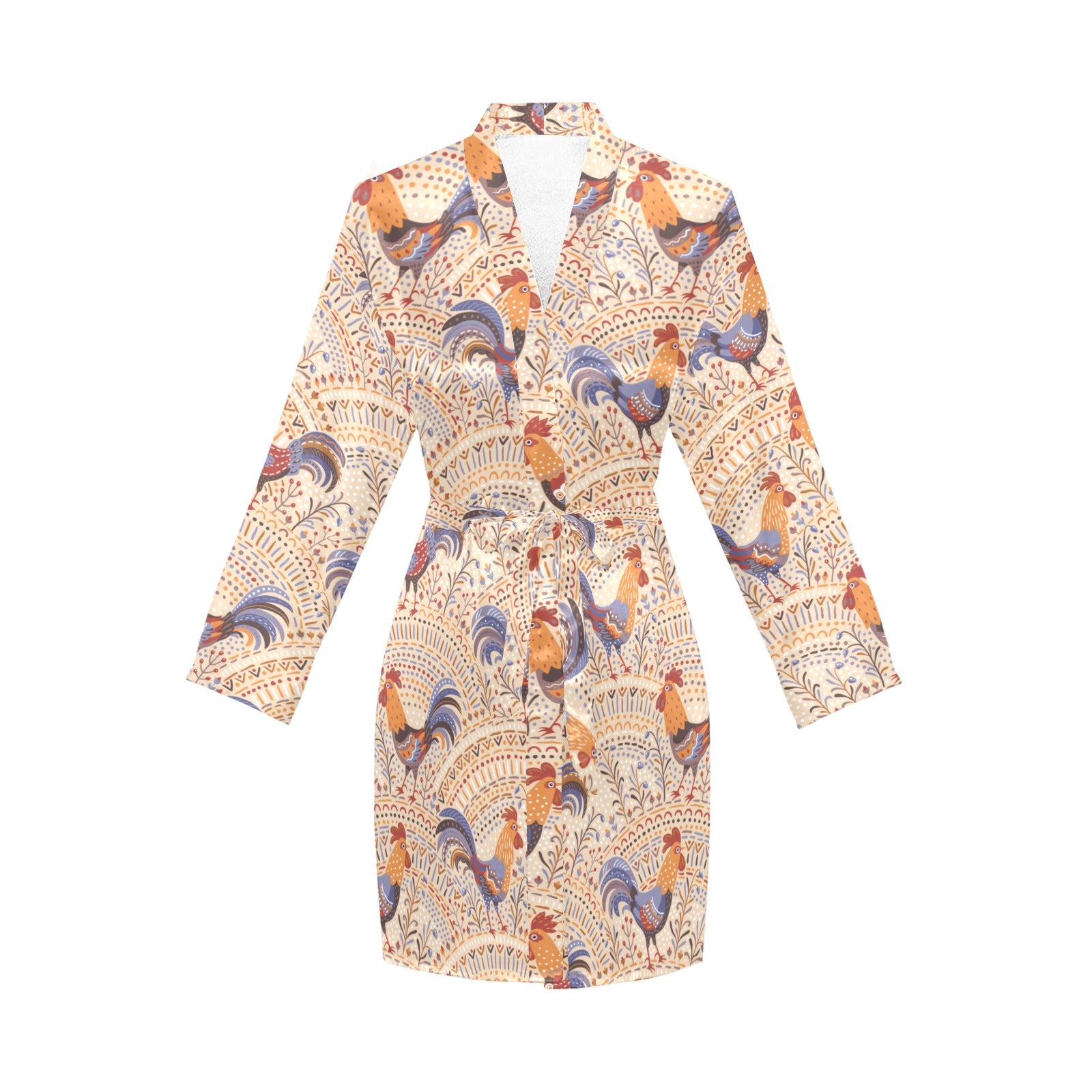 Cute rooster chicken cock floral ornament backgrou Women's Long Sleeve Belted Night Robe
