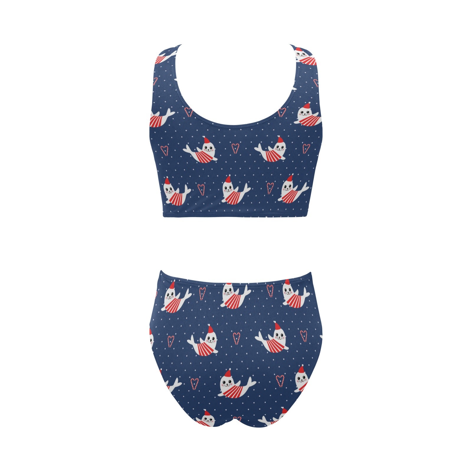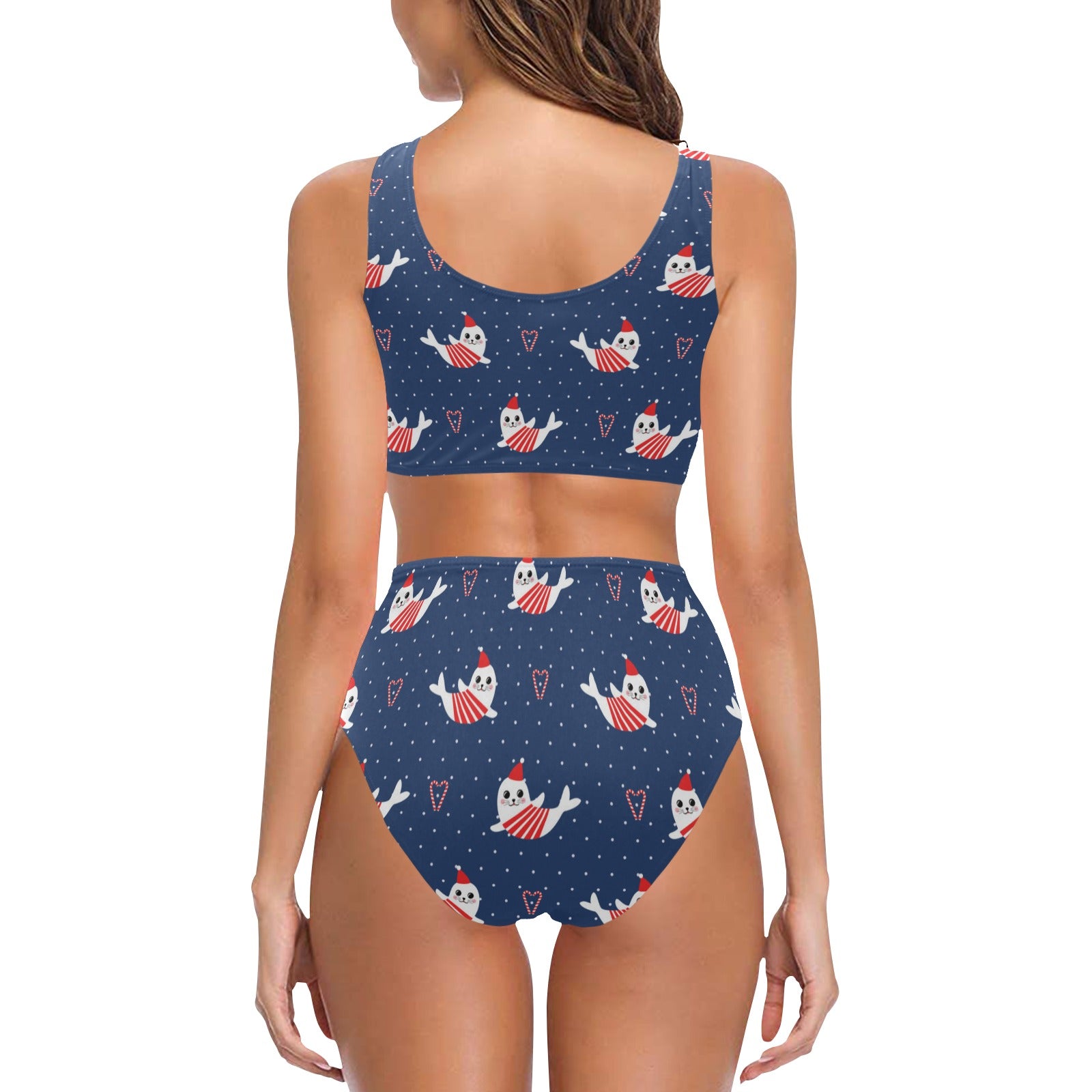 Cute sea lion seal christmas hat candy cane heart Chest Bowknot High Waisted Bikini Swimsuit