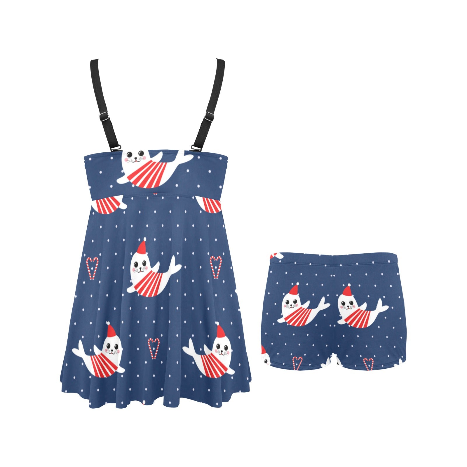 Cute sea lion seal christmas hat candy cane heart Chest Sexy Pleated Two Piece Swim Dress