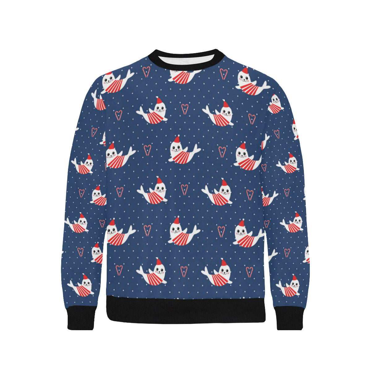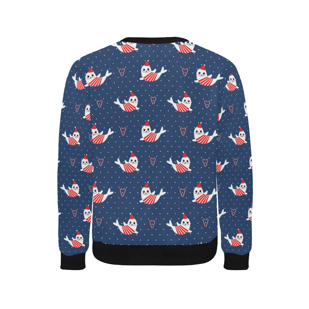Cute sea lion seal christmas hat candy cane heart Men's Crew Neck Sweatshirt