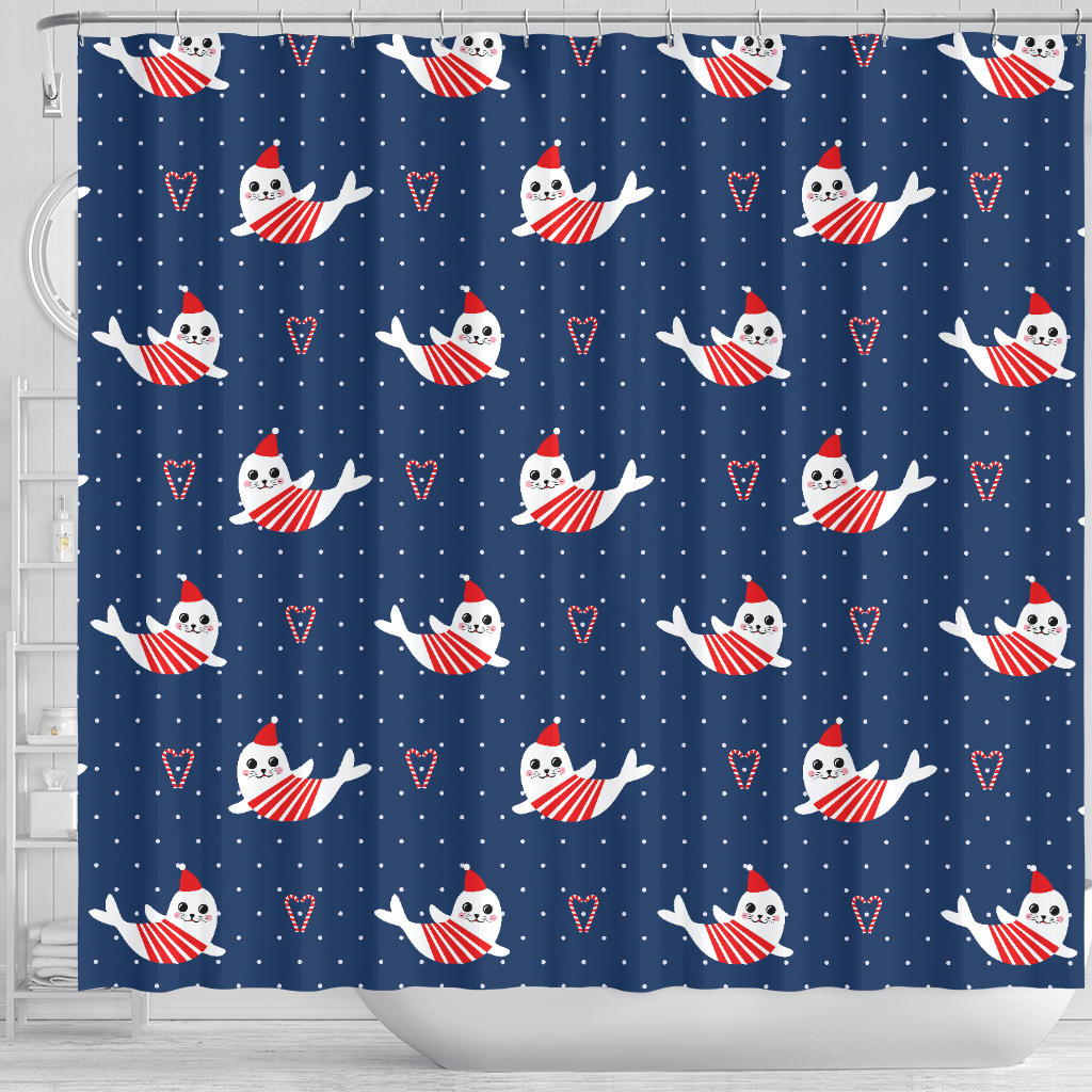Cute Sea Lion Seal Christmas Hat Candy Cane Heart Pattern Shower Curtain Fulfilled In US