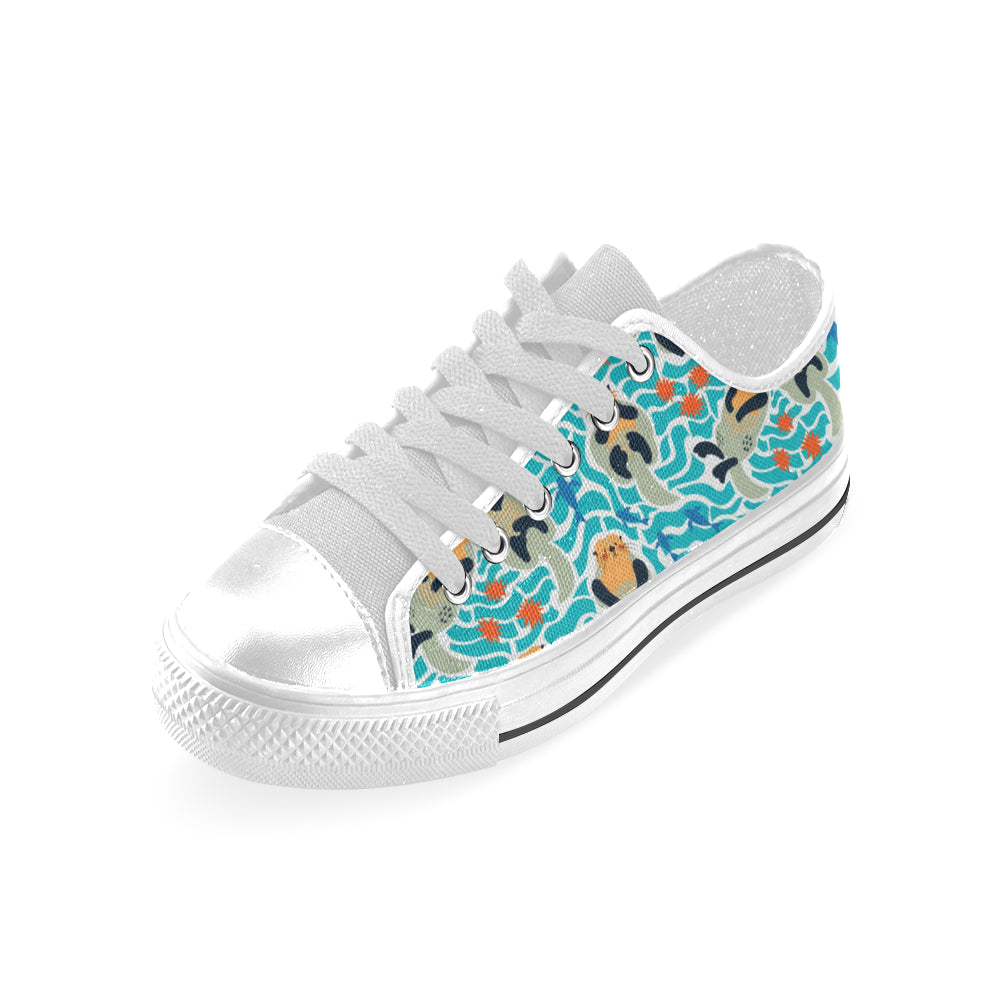 Cute sea otters fishe sea urchin pattern Men's Low Top Canvas Shoes White
