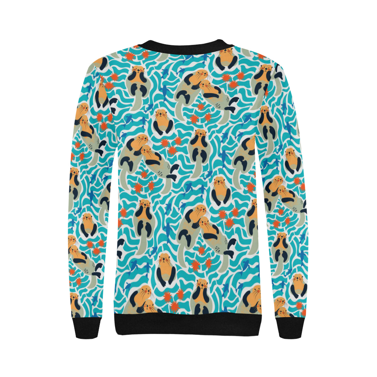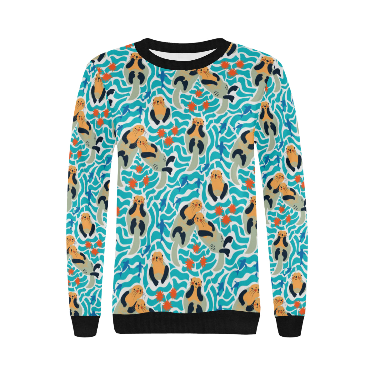 Cute sea otters fishe sea urchin pattern Women's Crew Neck Sweatshirt
