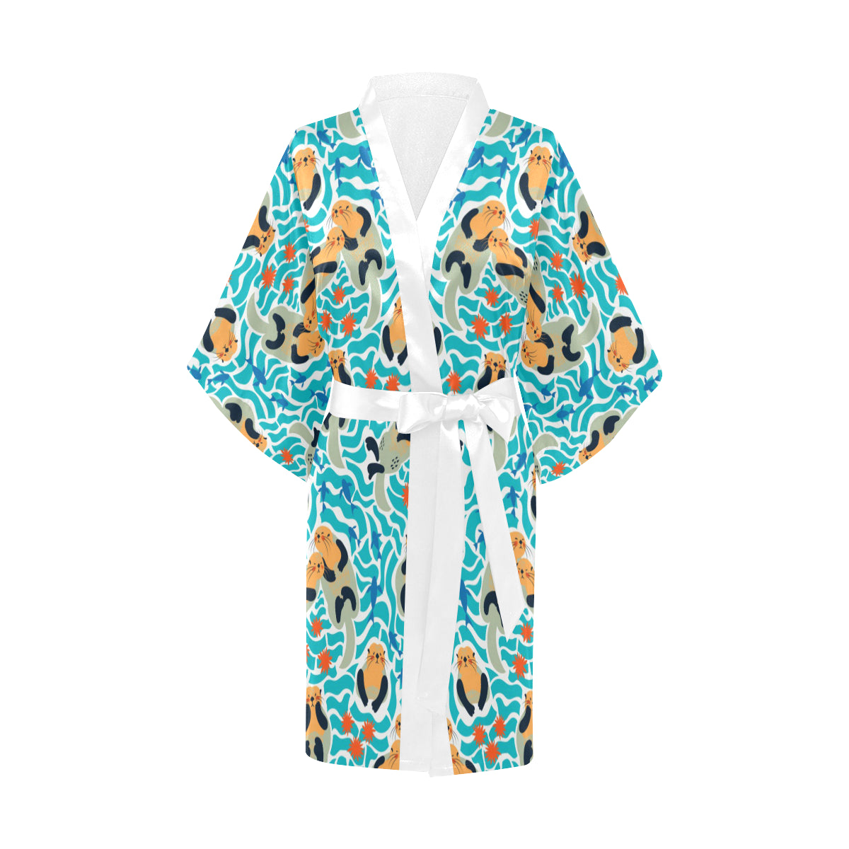 Cute sea otters fishe sea urchin pattern Women's Short Kimono Robe
