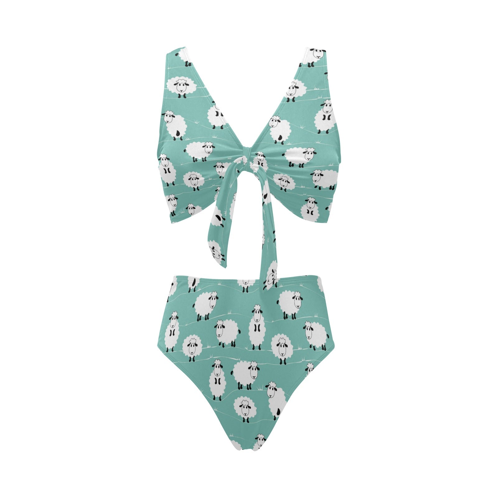 Cute sheep green background Chest Bowknot High Waisted Bikini Swimsuit