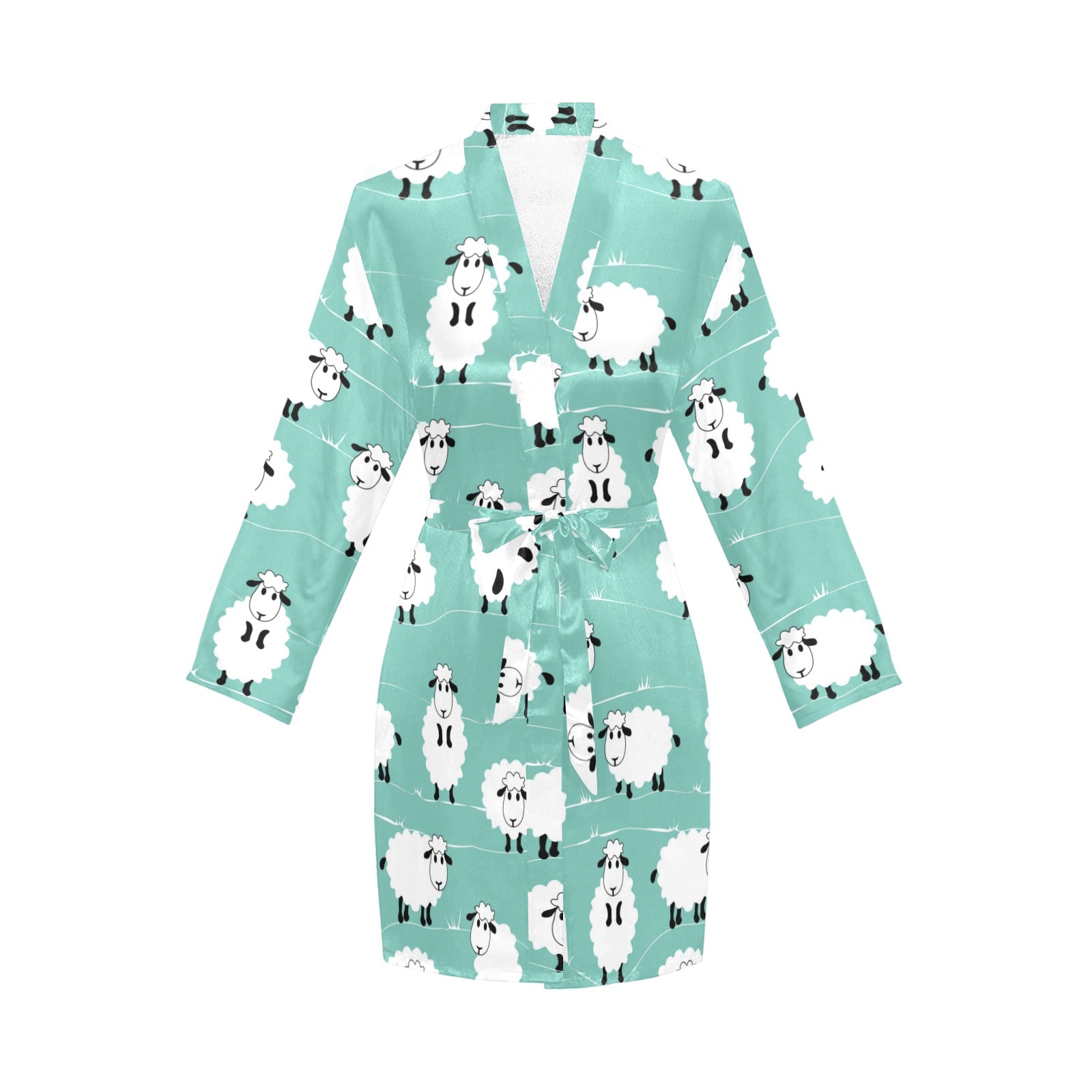Cute sheep green background Women's Long Sleeve Belted Night Robe
