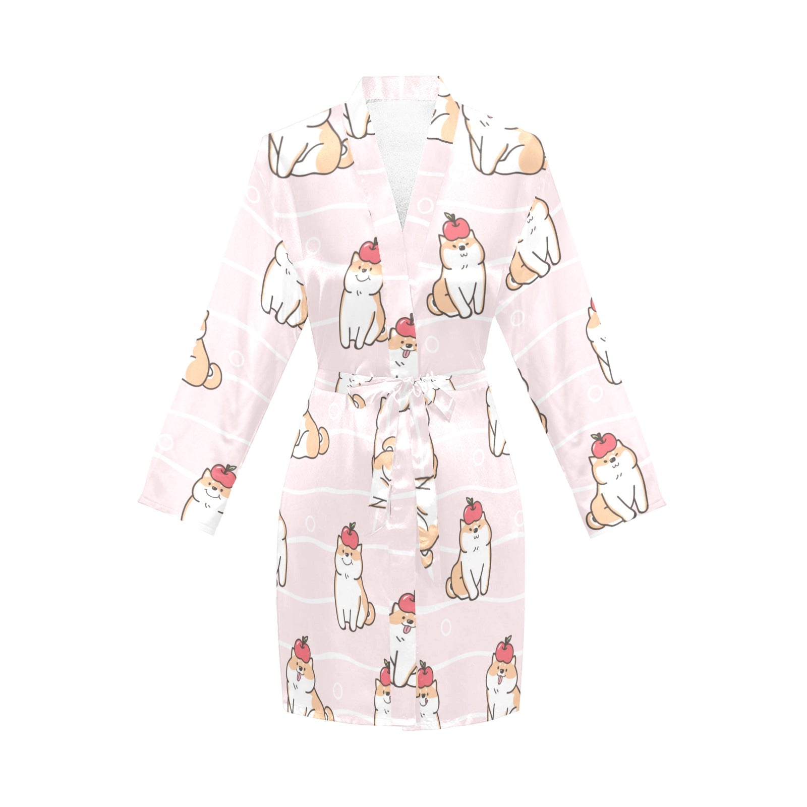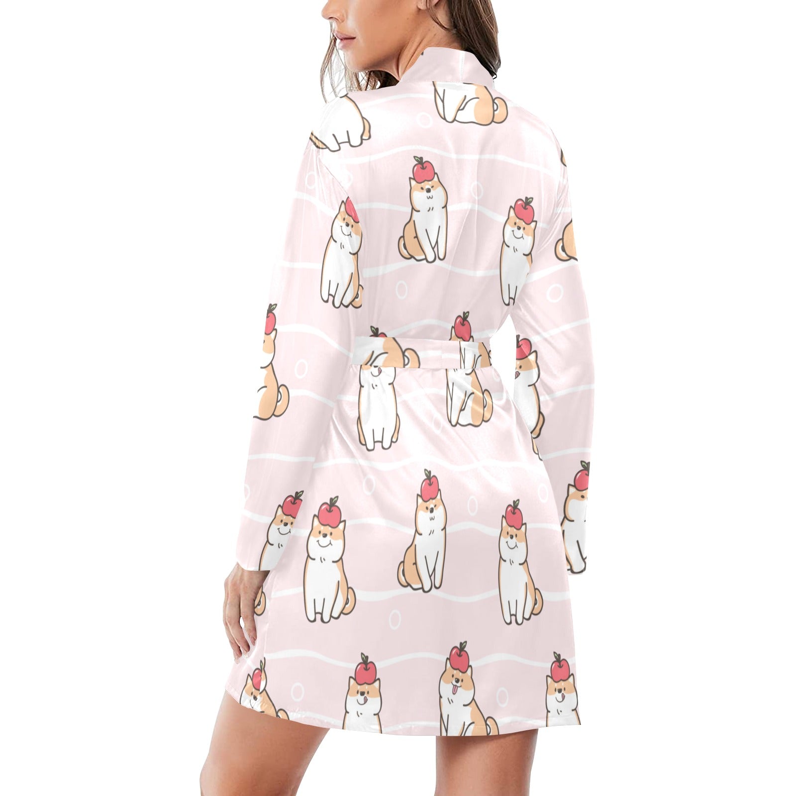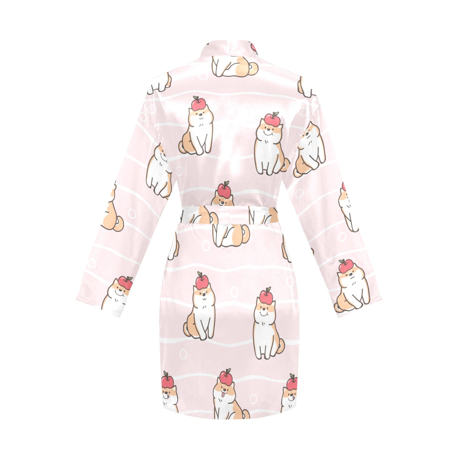 Cute Shiba Inu Dog Apple pattern Women's Long Sleeve Belted Night Robe