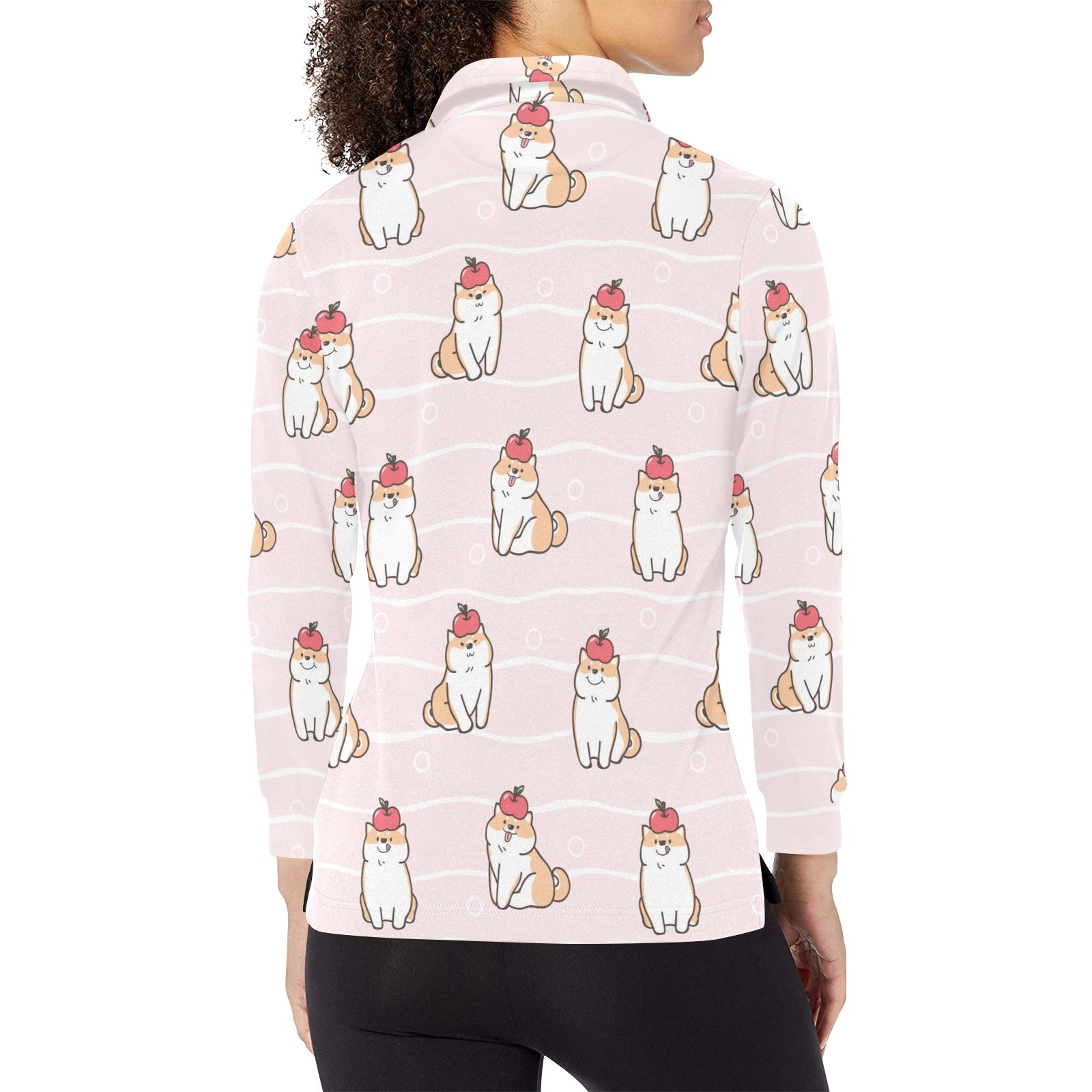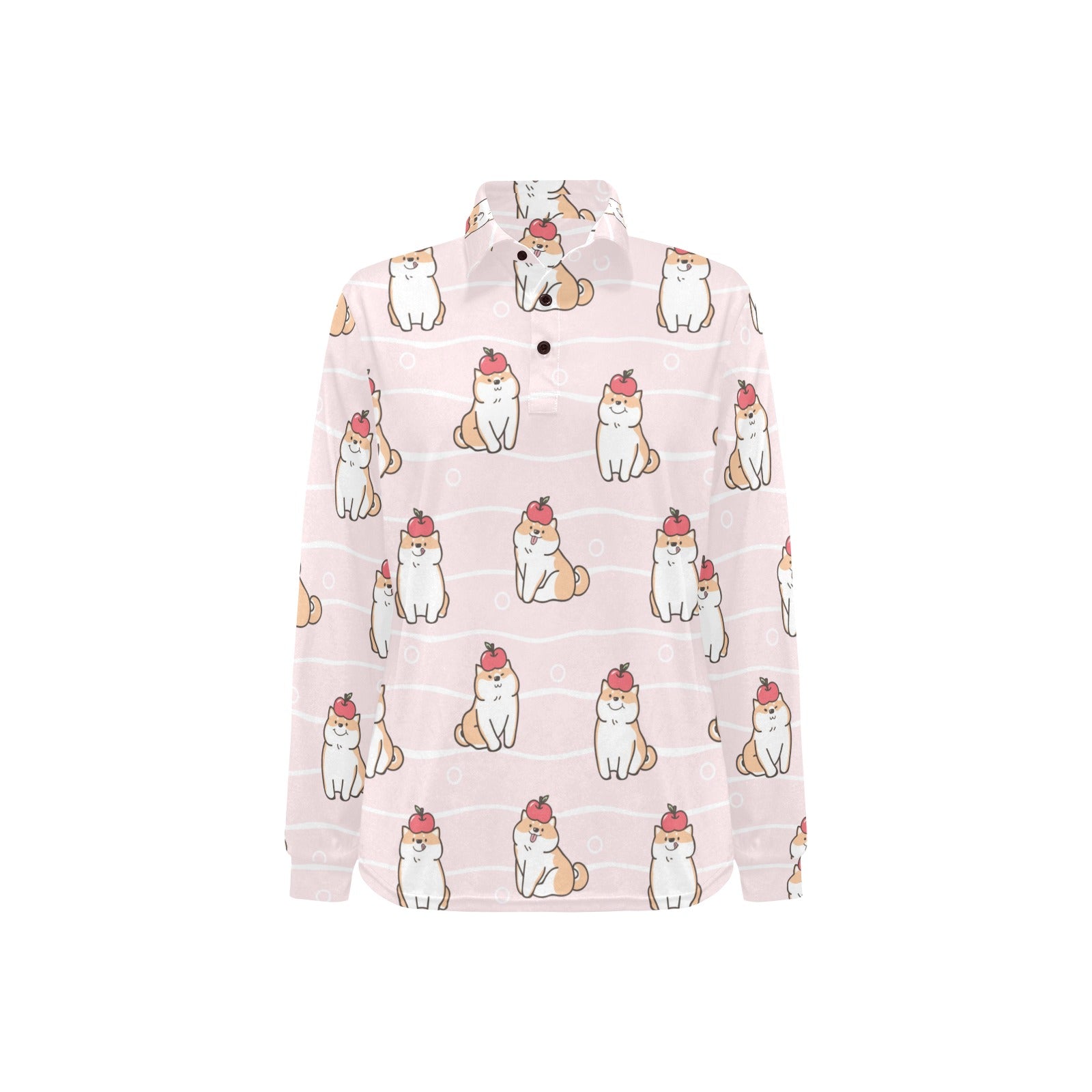 Cute Shiba Inu Dog Apple pattern Women's Long Sleeve Polo Shirt