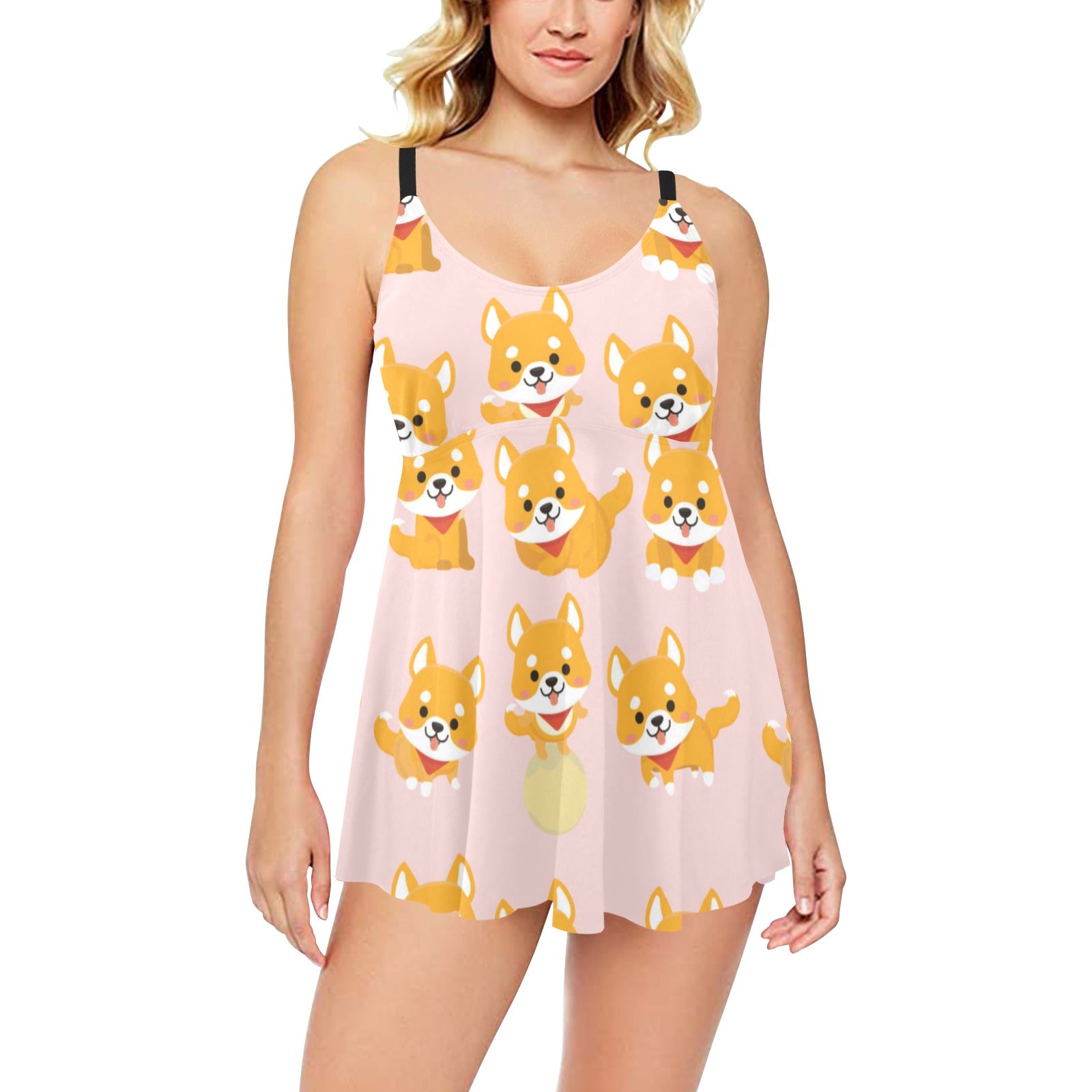 Cute shiba inu dog pattern Chest Sexy Pleated Two Piece Swim Dress
