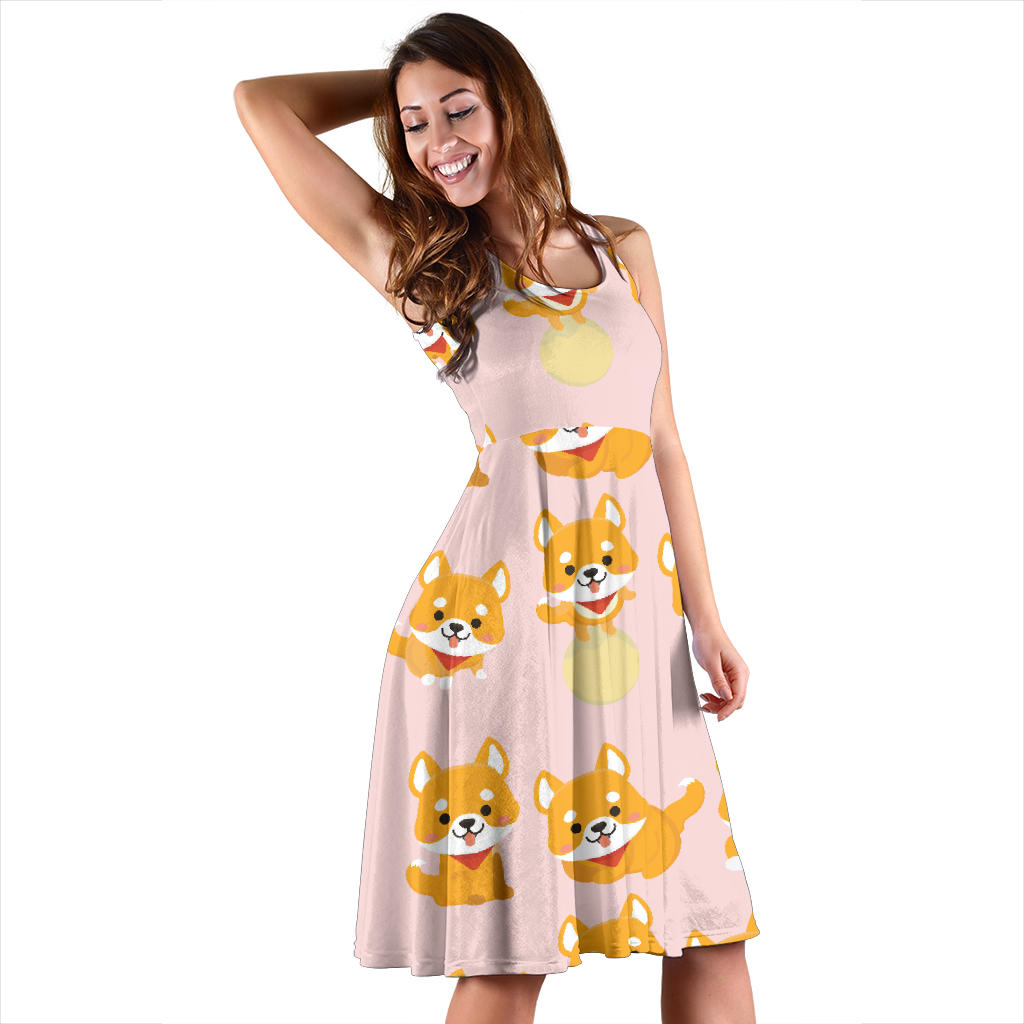 Cute Shiba Inu Dog Pattern Sleeveless Midi Dress