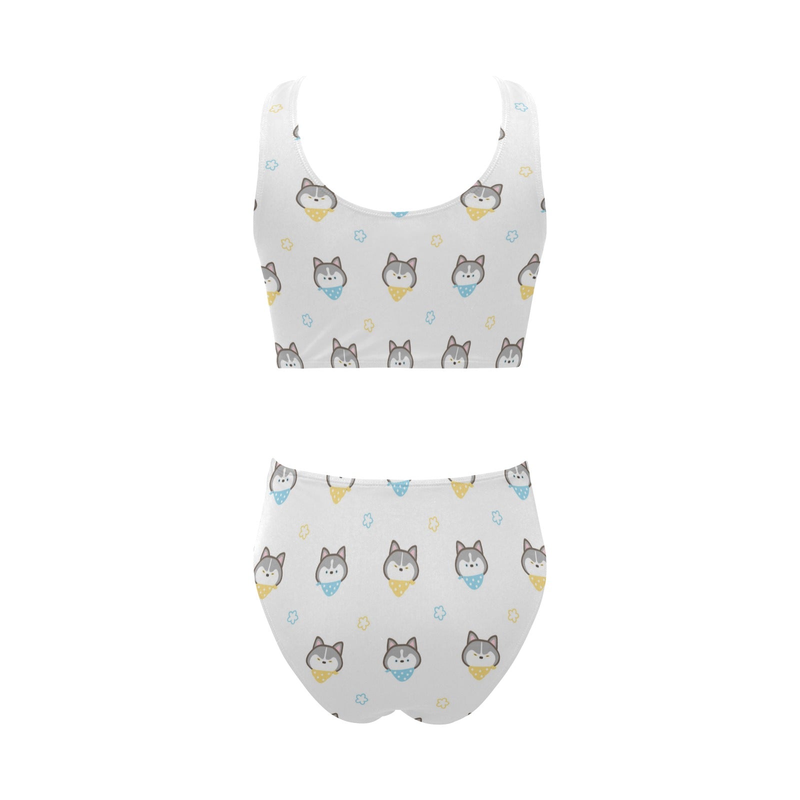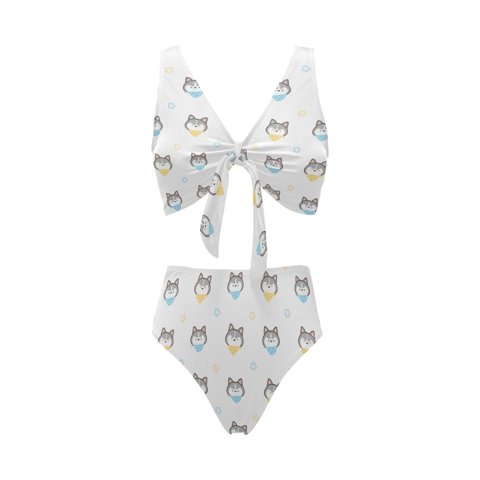 Cute Siberian Husky pattern Chest Bowknot High Waisted Bikini Swimsuit