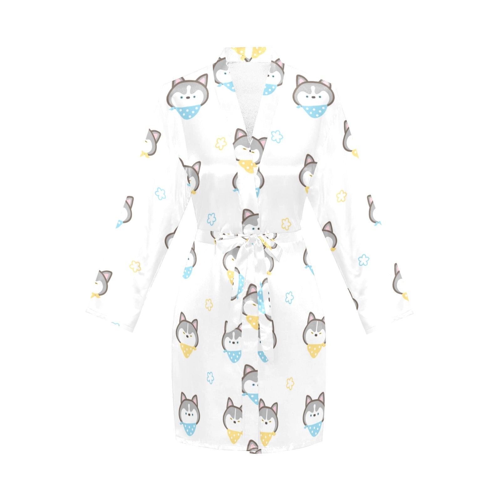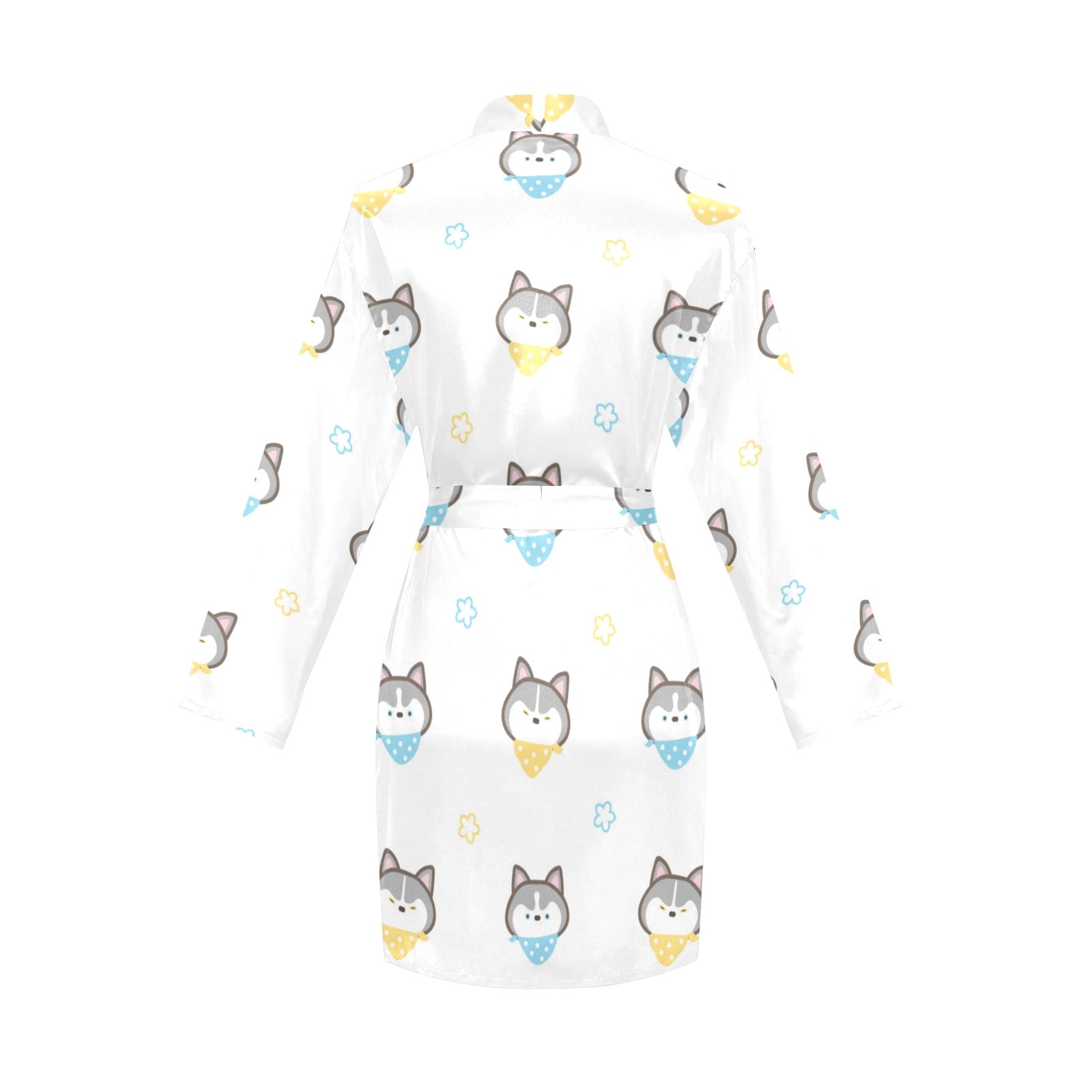 Cute Siberian Husky pattern Women's Long Sleeve Belted Night Robe