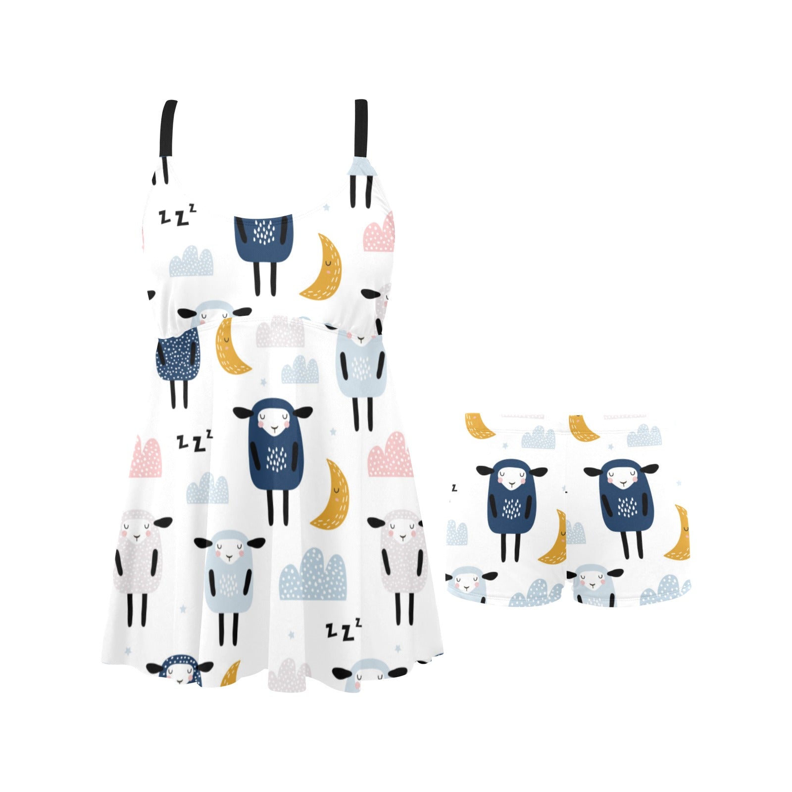 Cute sleeping sheep moon cloud pattern Chest Sexy Pleated Two Piece Swim Dress