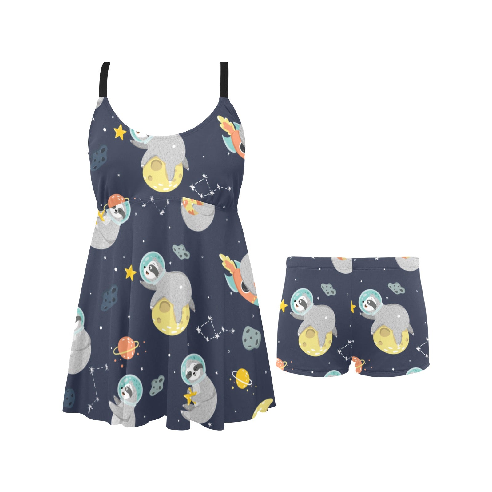 Cute sloth astronaut star planet rocket pattern Chest Sexy Pleated Two Piece Swim Dress