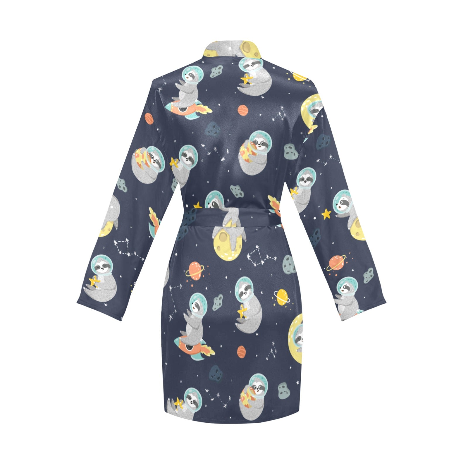 Cute sloth astronaut star planet rocket pattern Women's Long Sleeve Belted Night Robe