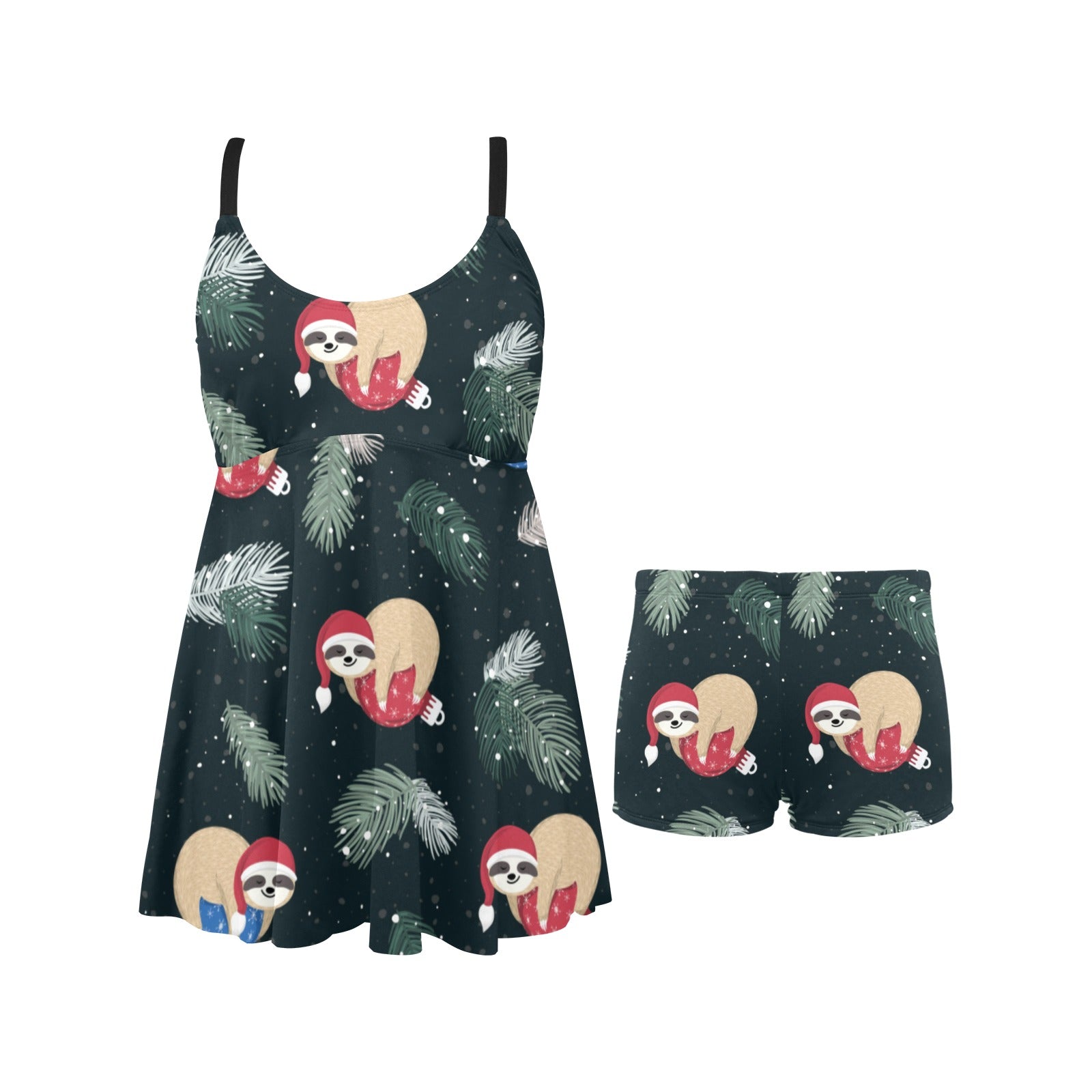 Cute sloths sleeping christmas ball santa hat patt Chest Sexy Pleated Two Piece Swim Dress