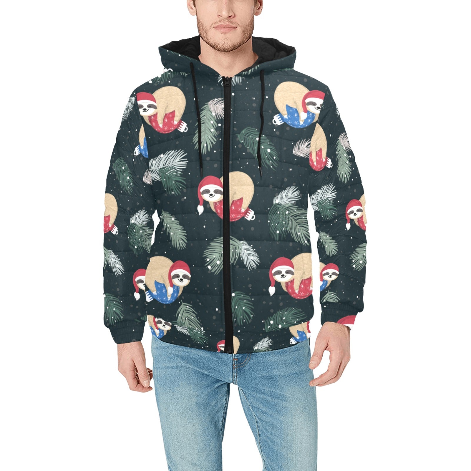 Cute sloths sleeping christmas ball santa hat patt Men's Padded Hooded Jacket