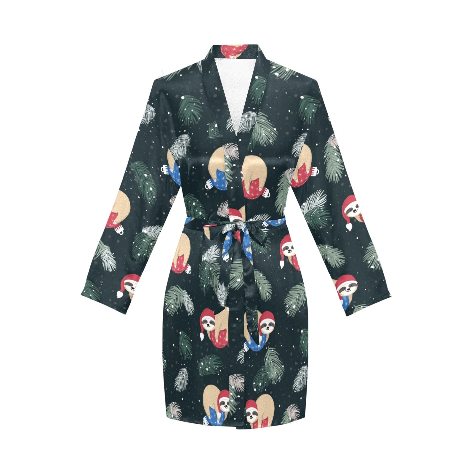 Cute sloths sleeping christmas ball santa hat patt Women's Long Sleeve Belted Night Robe