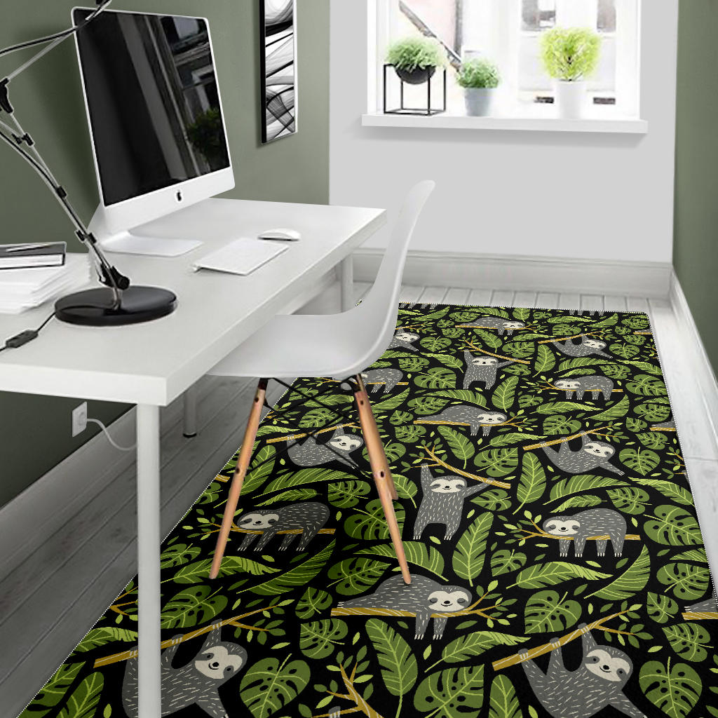 Cute sloths tropical palm leaves black background Area Rug is a uniqued design and limited item. It made to order, hand printed, and sewn with love in our factory.