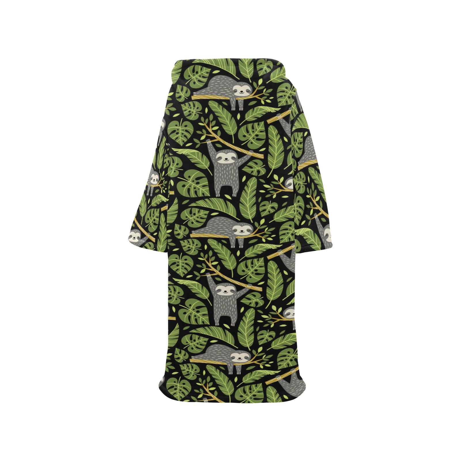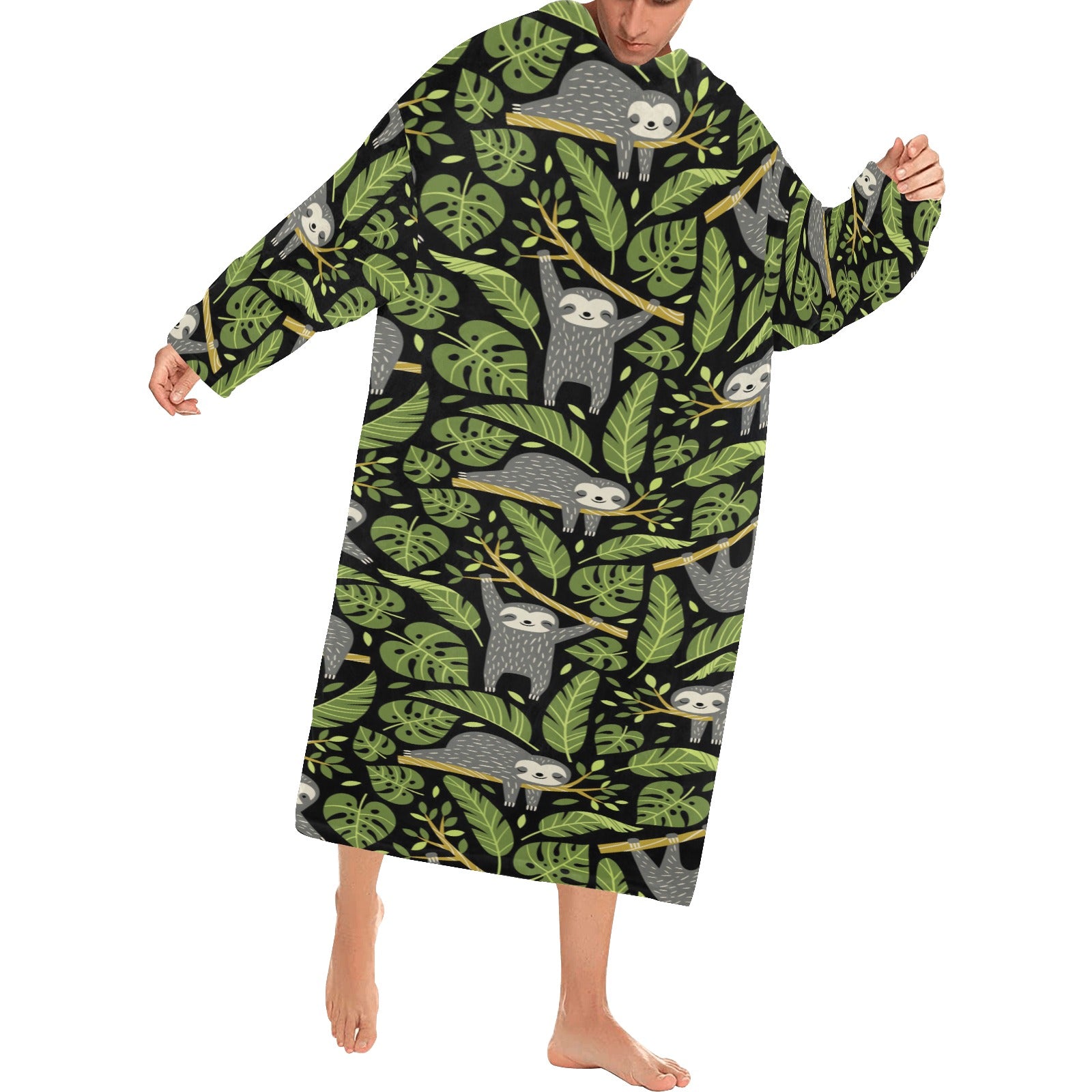Cute sloths tropical palm leaves black background Blanket Robe with Sleeves