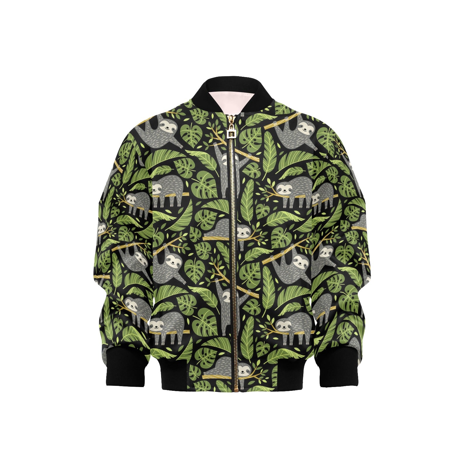Cute sloths tropical palm leaves black background Kids' Boys' Girls' Bomber Jacket
