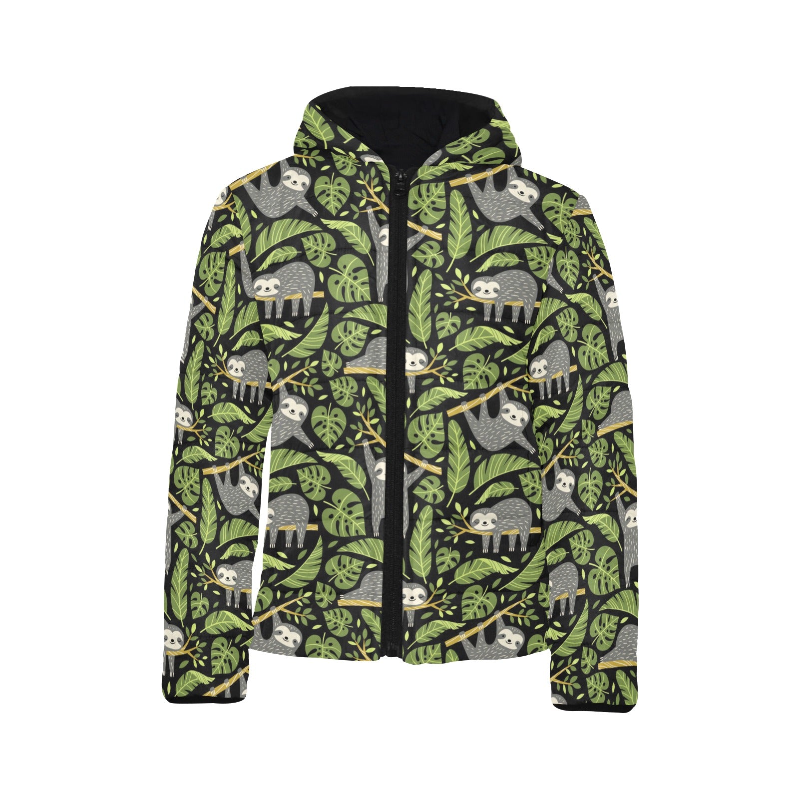 Cute sloths tropical palm leaves black background Kids' Boys' Girls' Padded Hooded Jacket