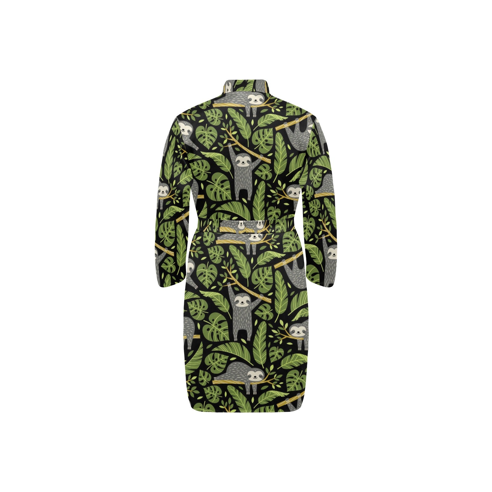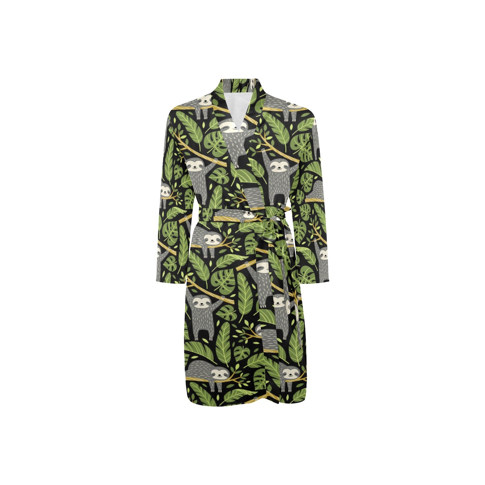 Cute sloths tropical palm leaves black background Men's Long Sleeve Belted Night Robe