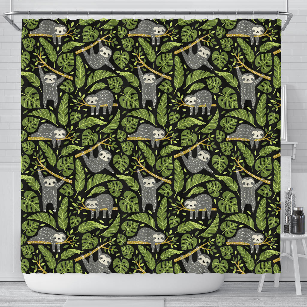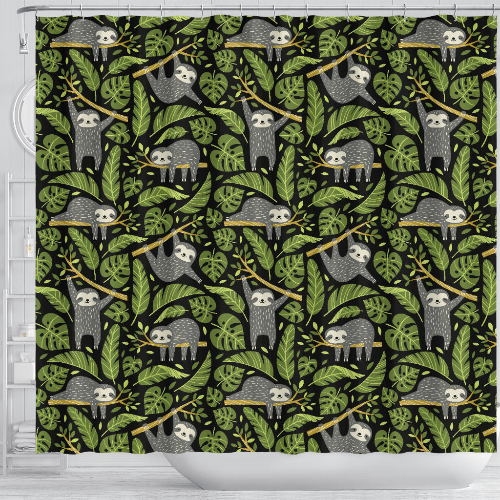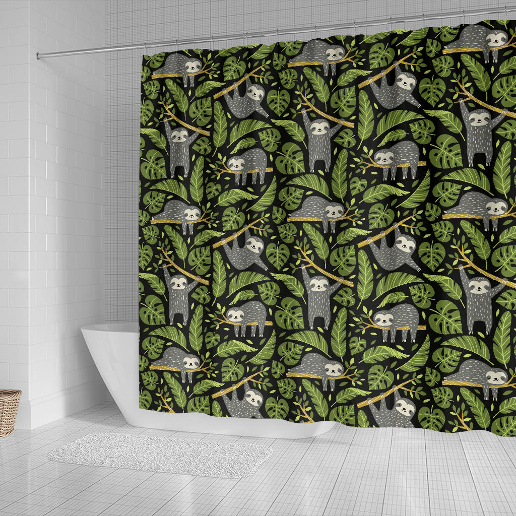 Cute sloths tropical palm leaves black background Shower Curtain is a uniqued design and limited item. It made to order, hand printed, and sewn with love in our factory.