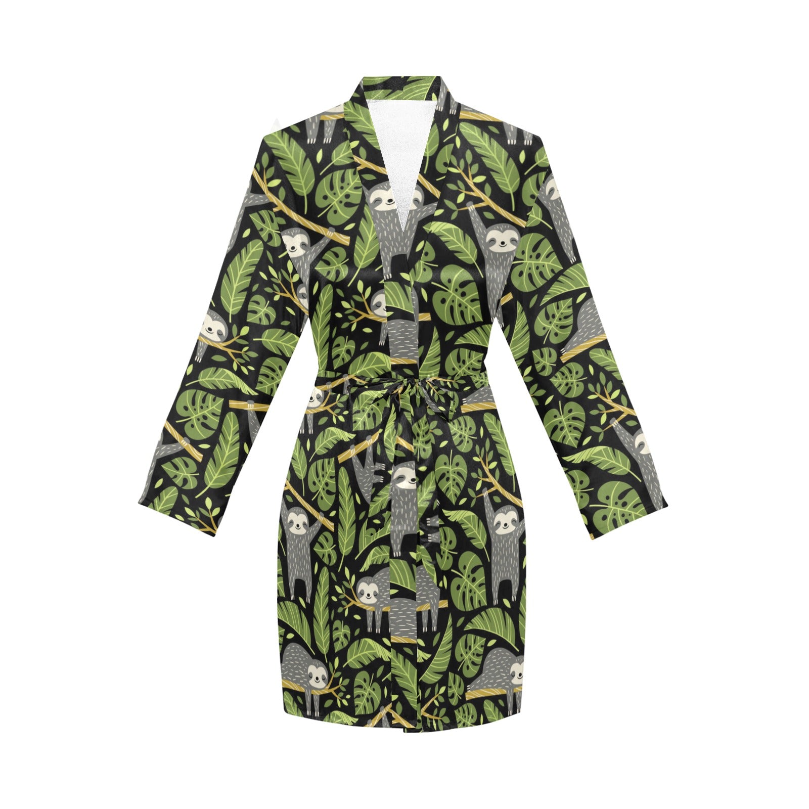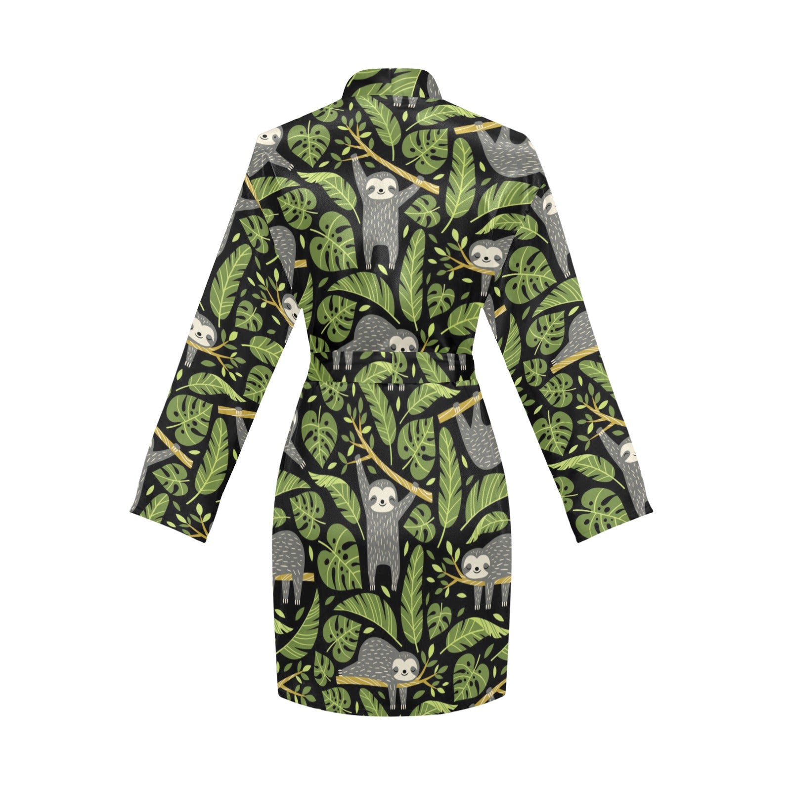 Cute sloths tropical palm leaves black background Women's Long Sleeve Belted Night Robe