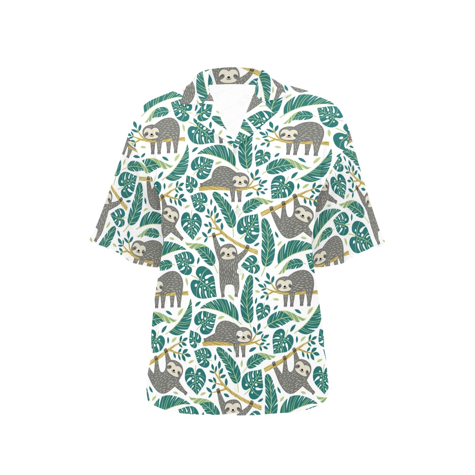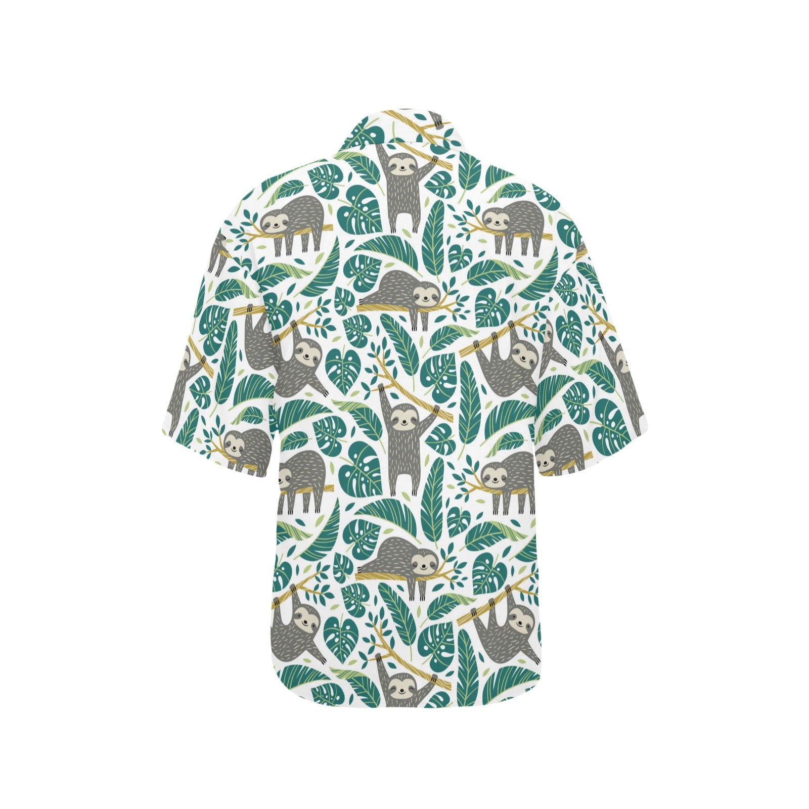 Cute sloths tropical palm leaves white background Women's All Over Print Hawaiian Shirt