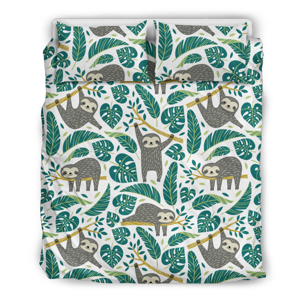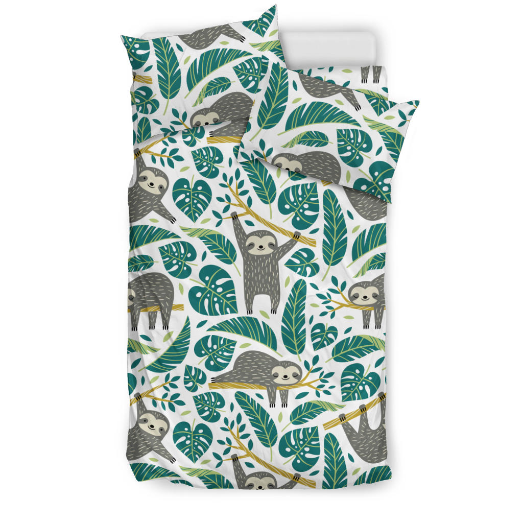 Cute Sloths Tropical Palm Leaves White Background Bedding Set
