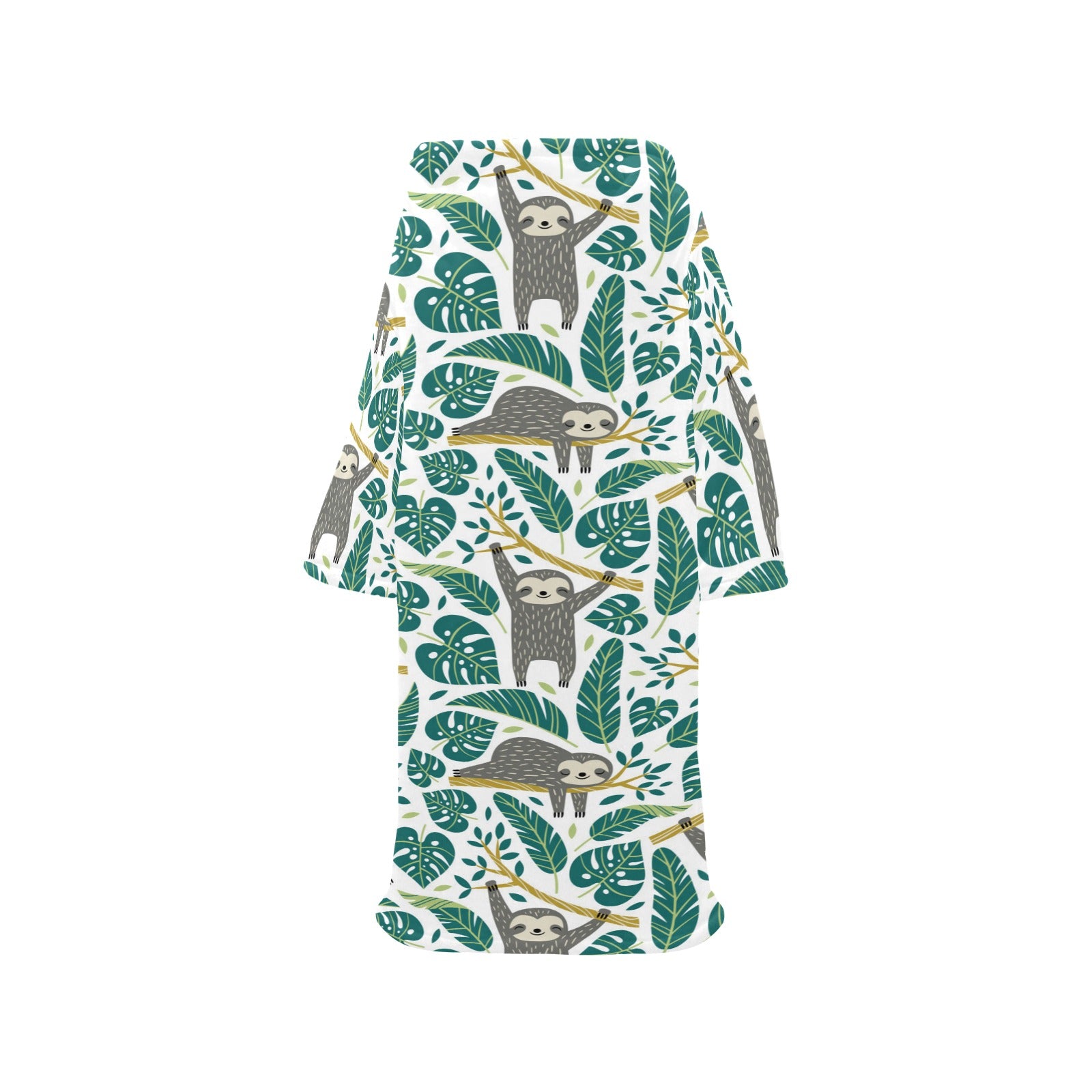 Cute sloths tropical palm leaves white background Blanket Robe with Sleeves