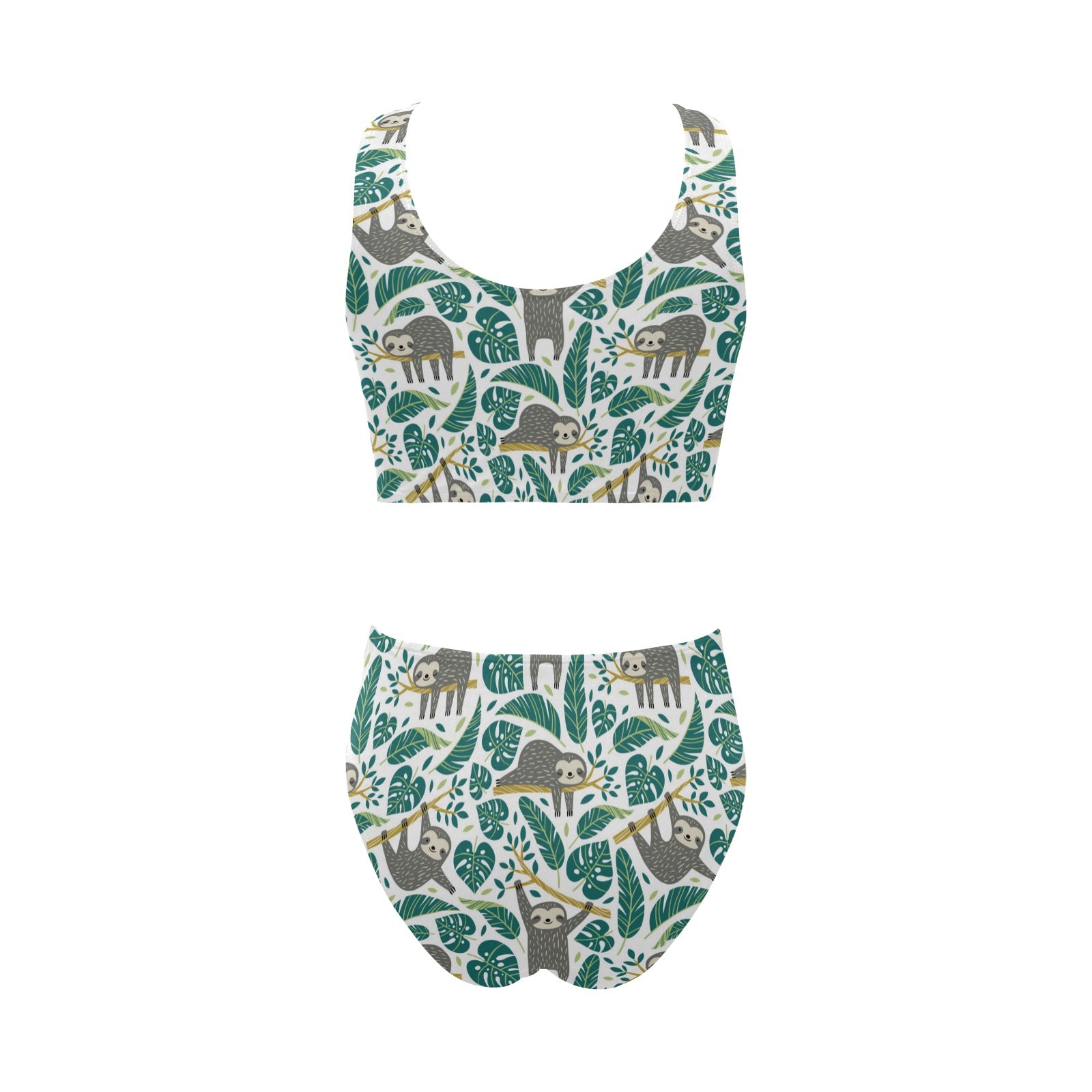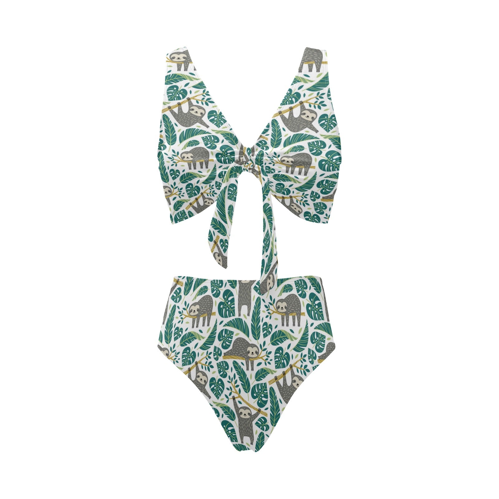 Cute sloths tropical palm leaves white background Chest Bowknot High Waisted Bikini Swimsuit