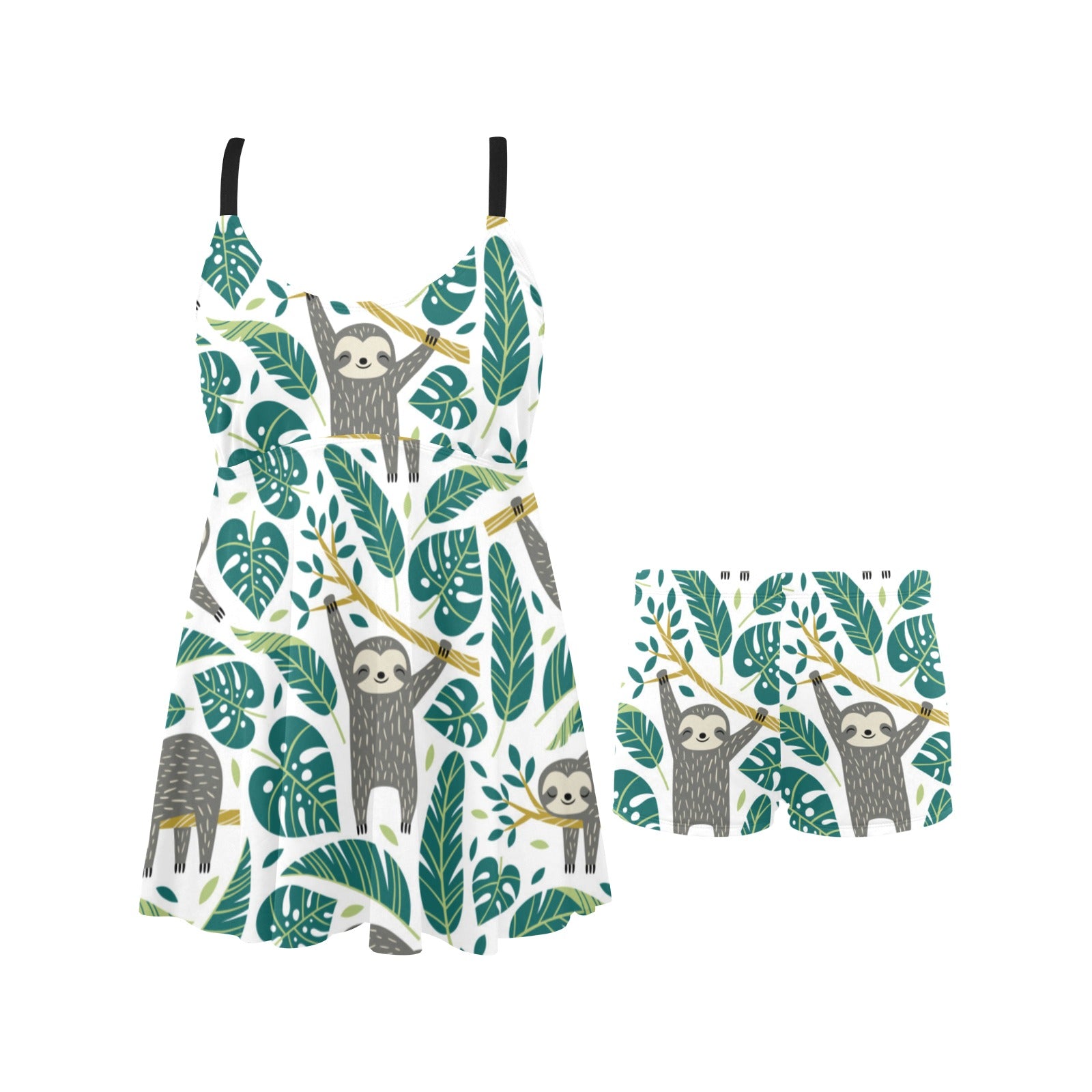 Cute sloths tropical palm leaves white background Chest Sexy Pleated Two Piece Swim Dress