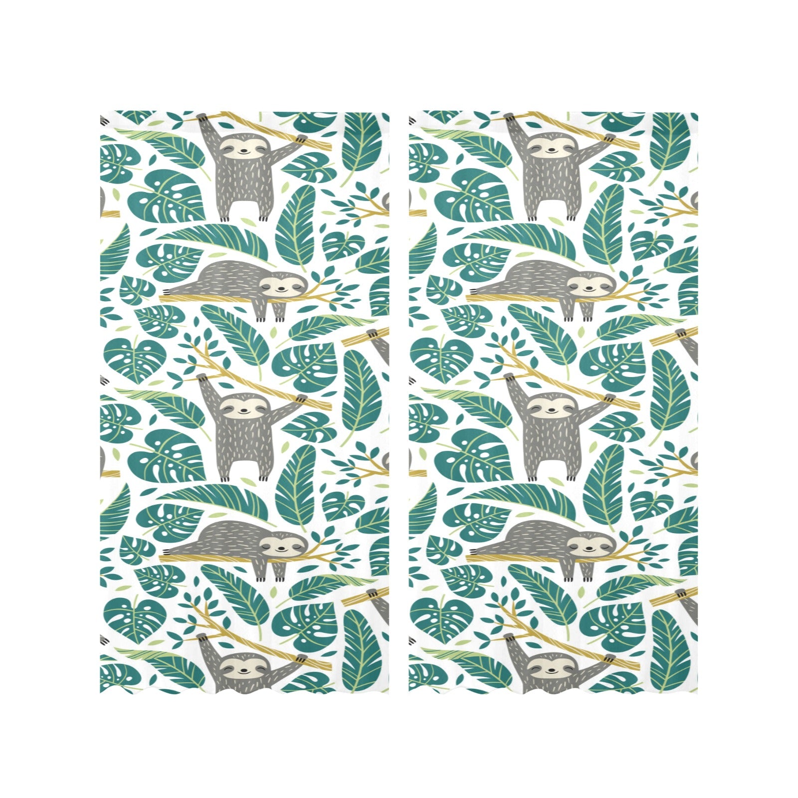 Cute sloths tropical palm leaves white background Gauze Curtain
