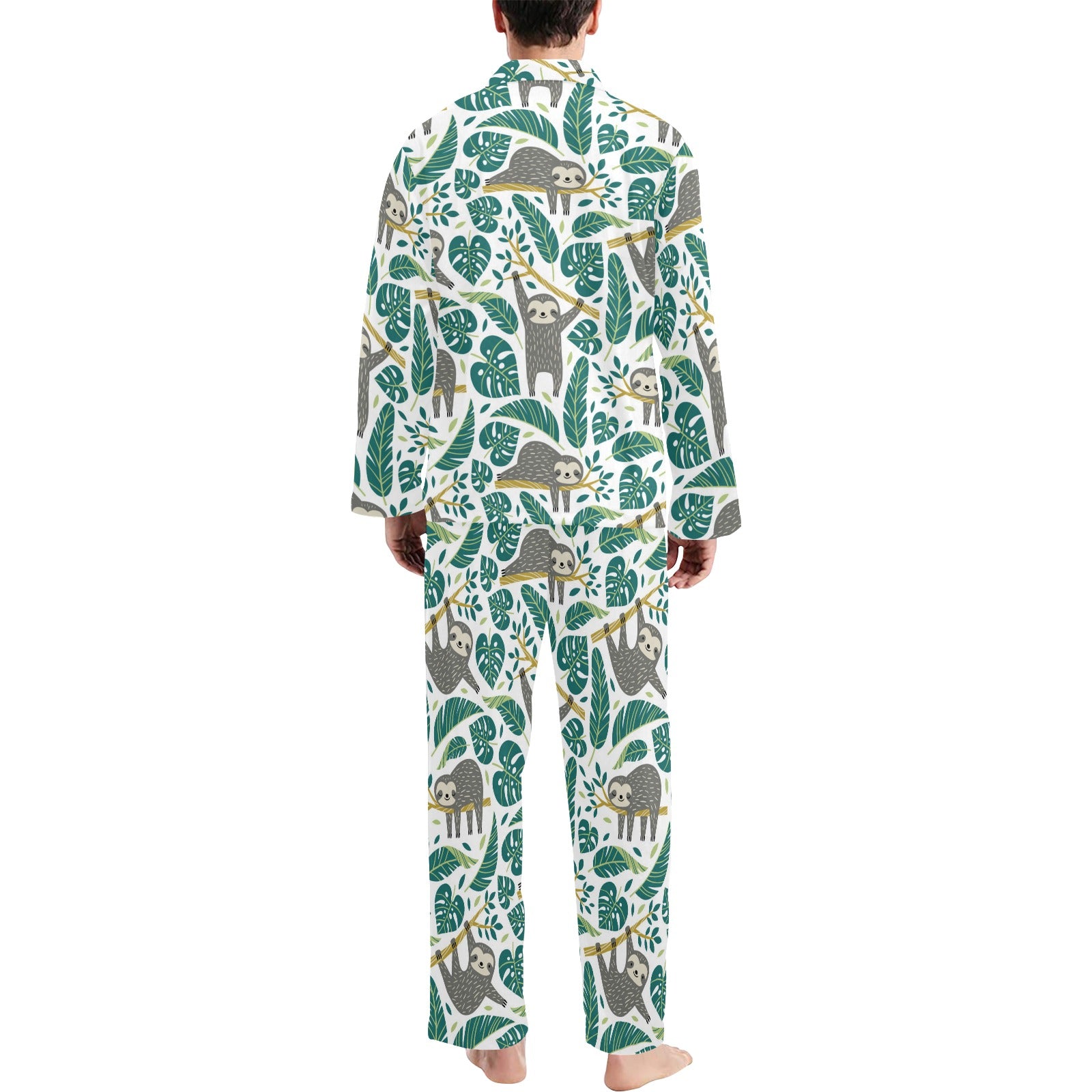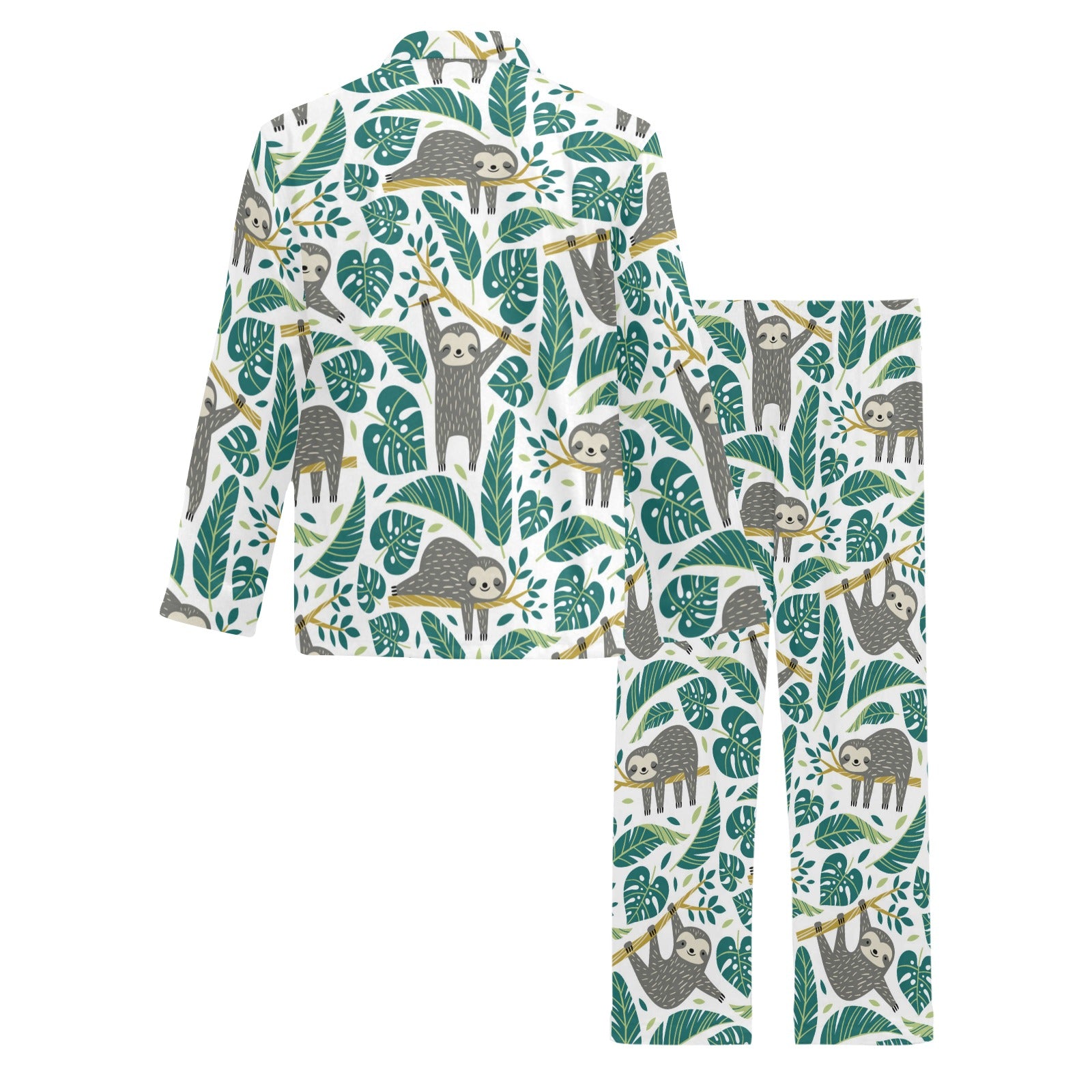 Cute sloths tropical palm leaves white background Men's Long Pajama Set