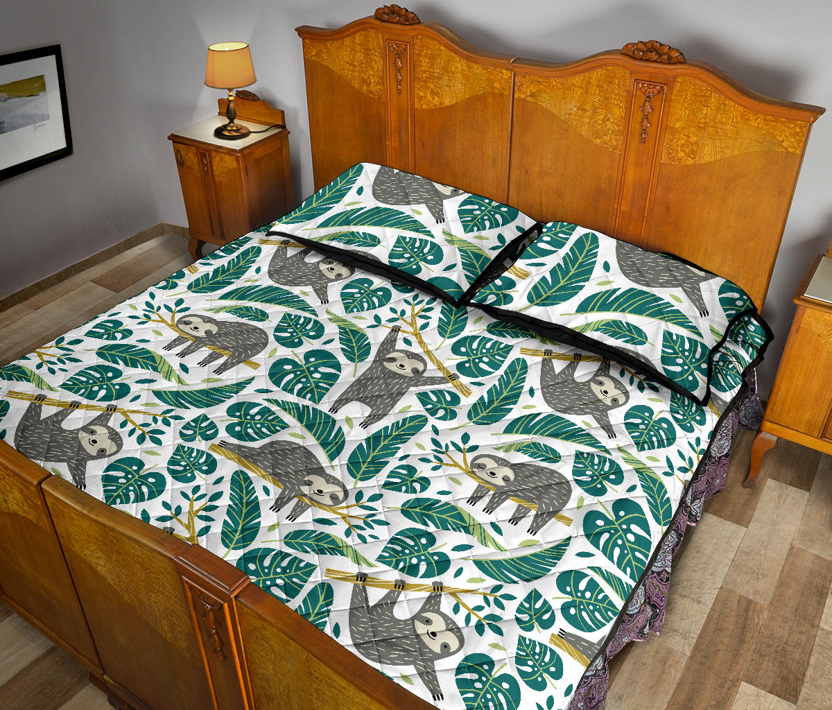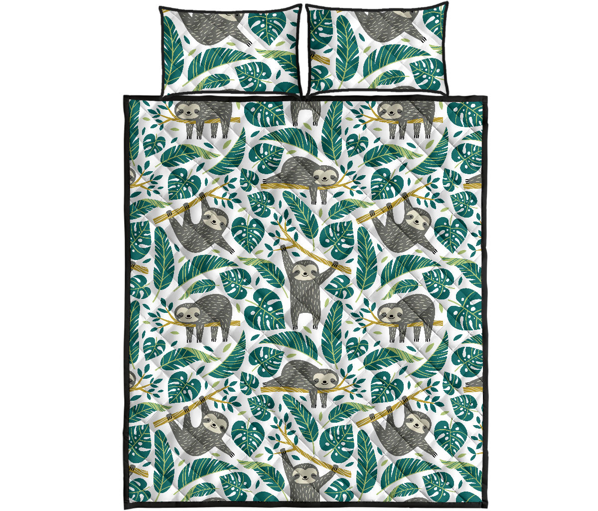 Cute sloths tropical palm leaves white background Quilt Bed Set
