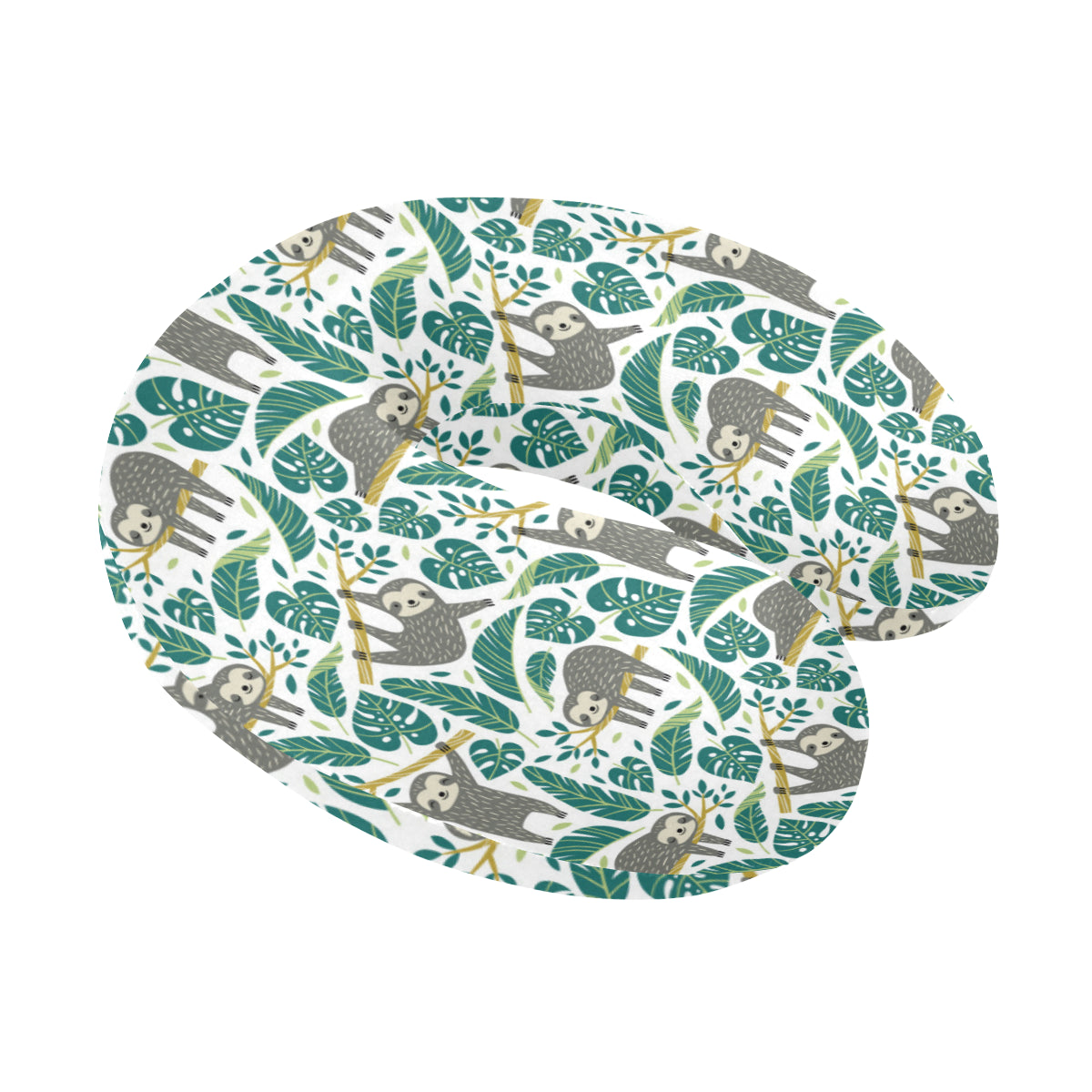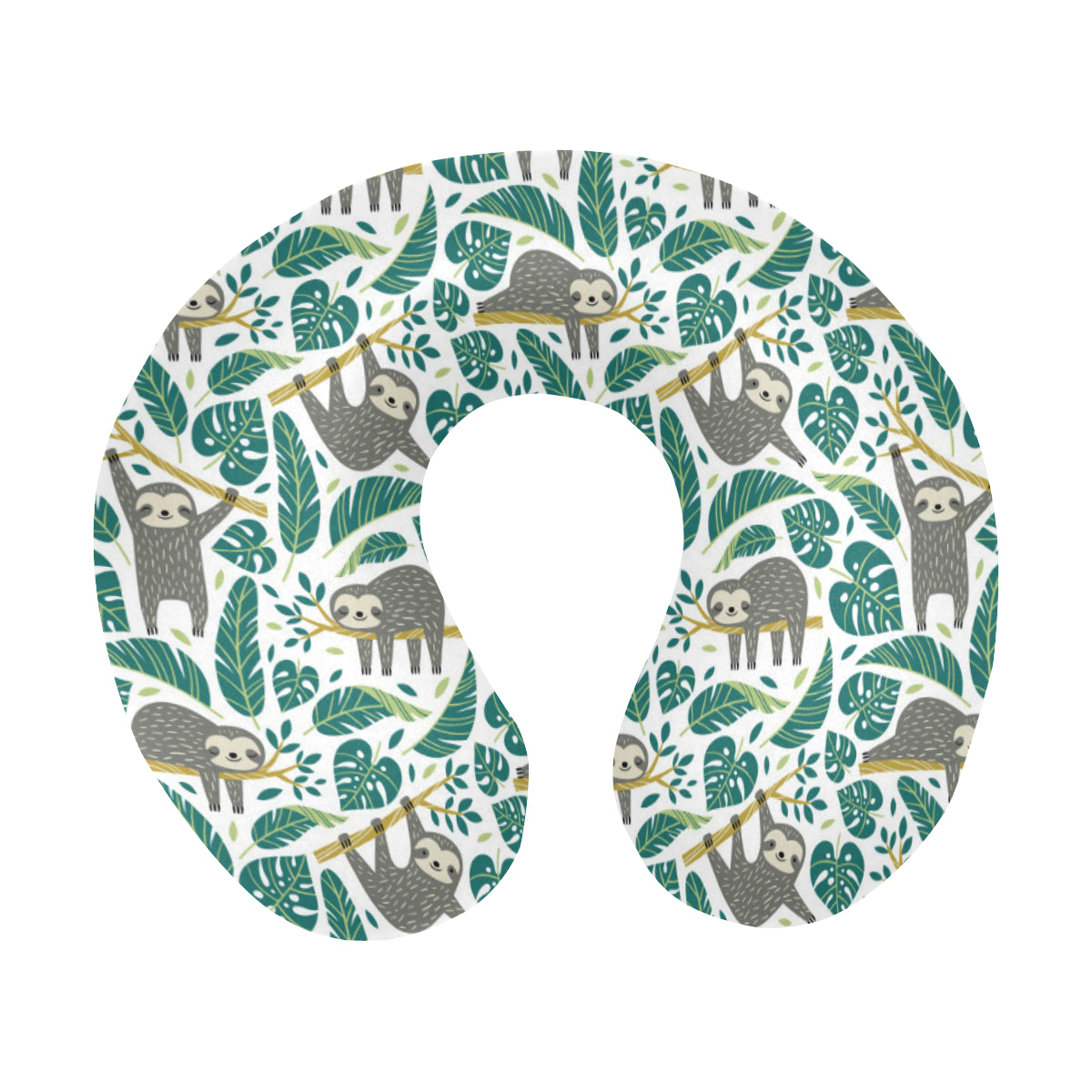 Cute sloths tropical palm leaves white background U-Shaped Travel Neck Pillow