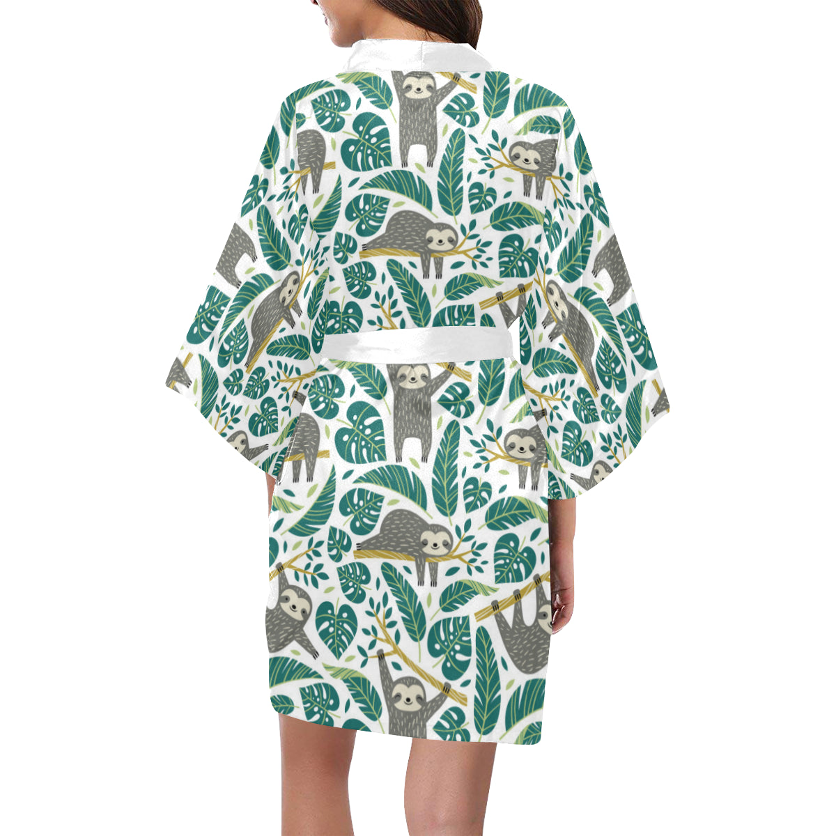 Cute sloths tropical palm leaves white background Women's Short Kimono Robe is a uniqued design and limited item. It made to order, hand printed, and sewn with love in our factory.