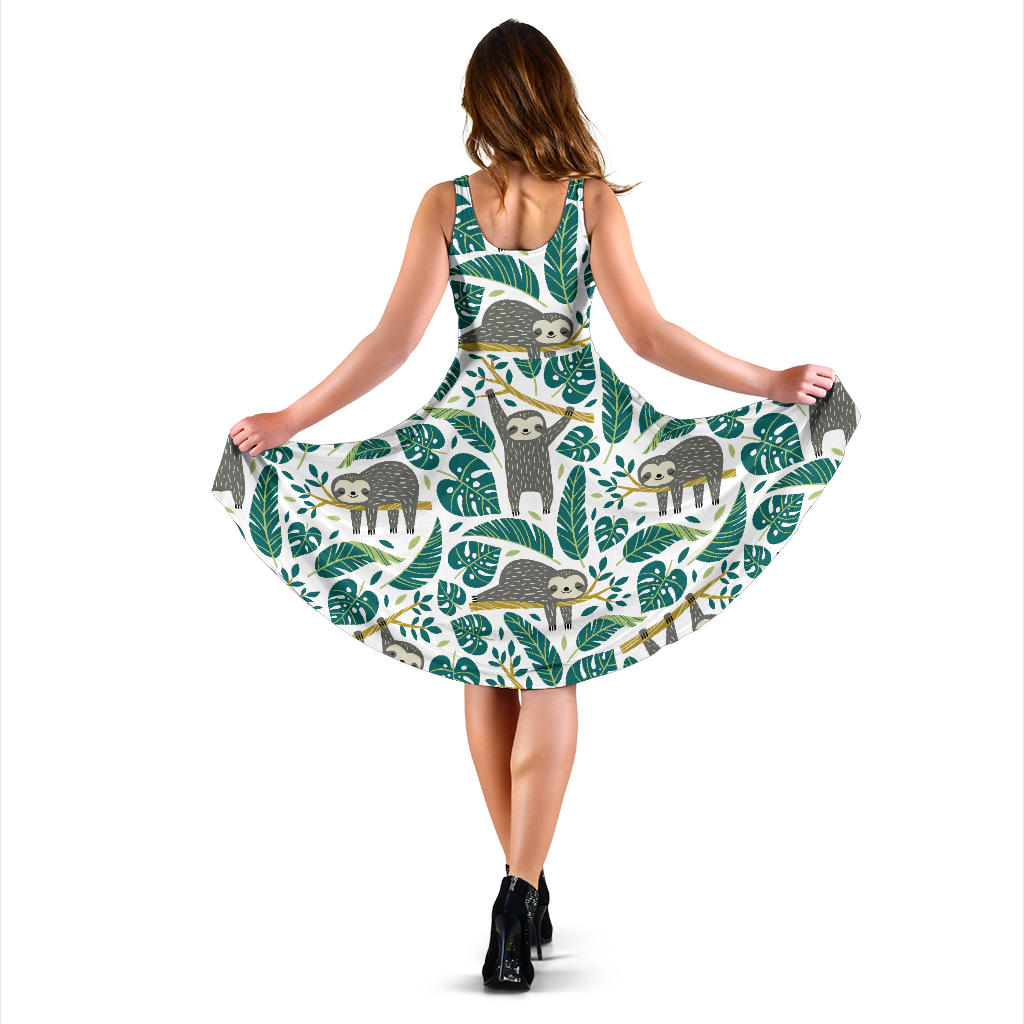 Cute Sloths Tropical Palm Leaves White Background Sleeveless Midi Dress