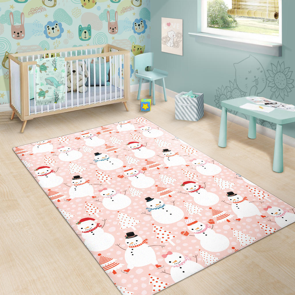 Cute snowman christmas tree snowpink background Area Rug is a uniqued design and limited item. It made to order, hand printed, and sewn with love in our factory.
