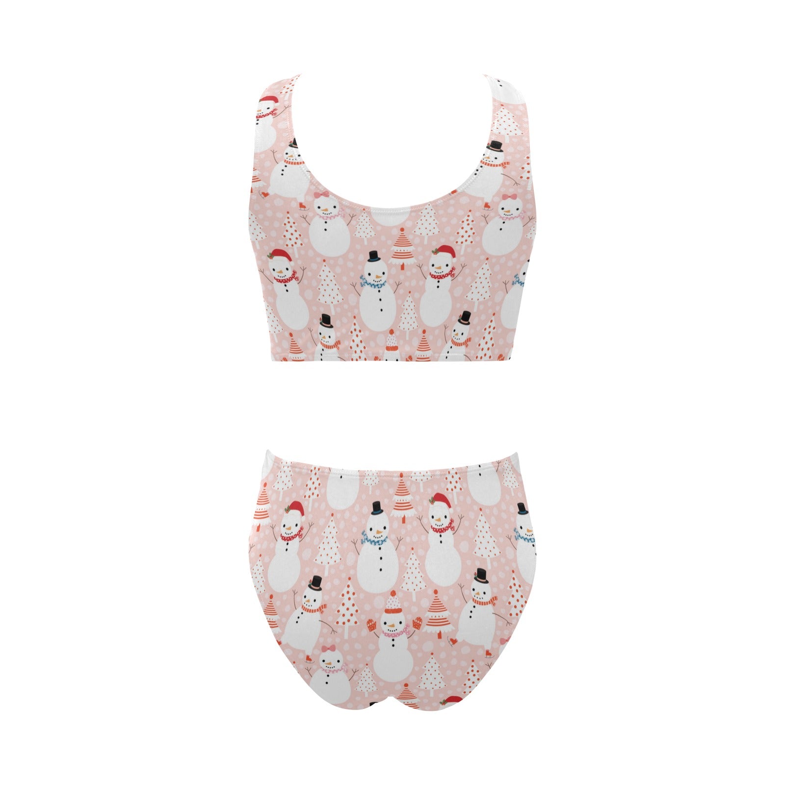 Cute snowman christmas tree snowpink background Chest Bowknot High Waisted Bikini Swimsuit