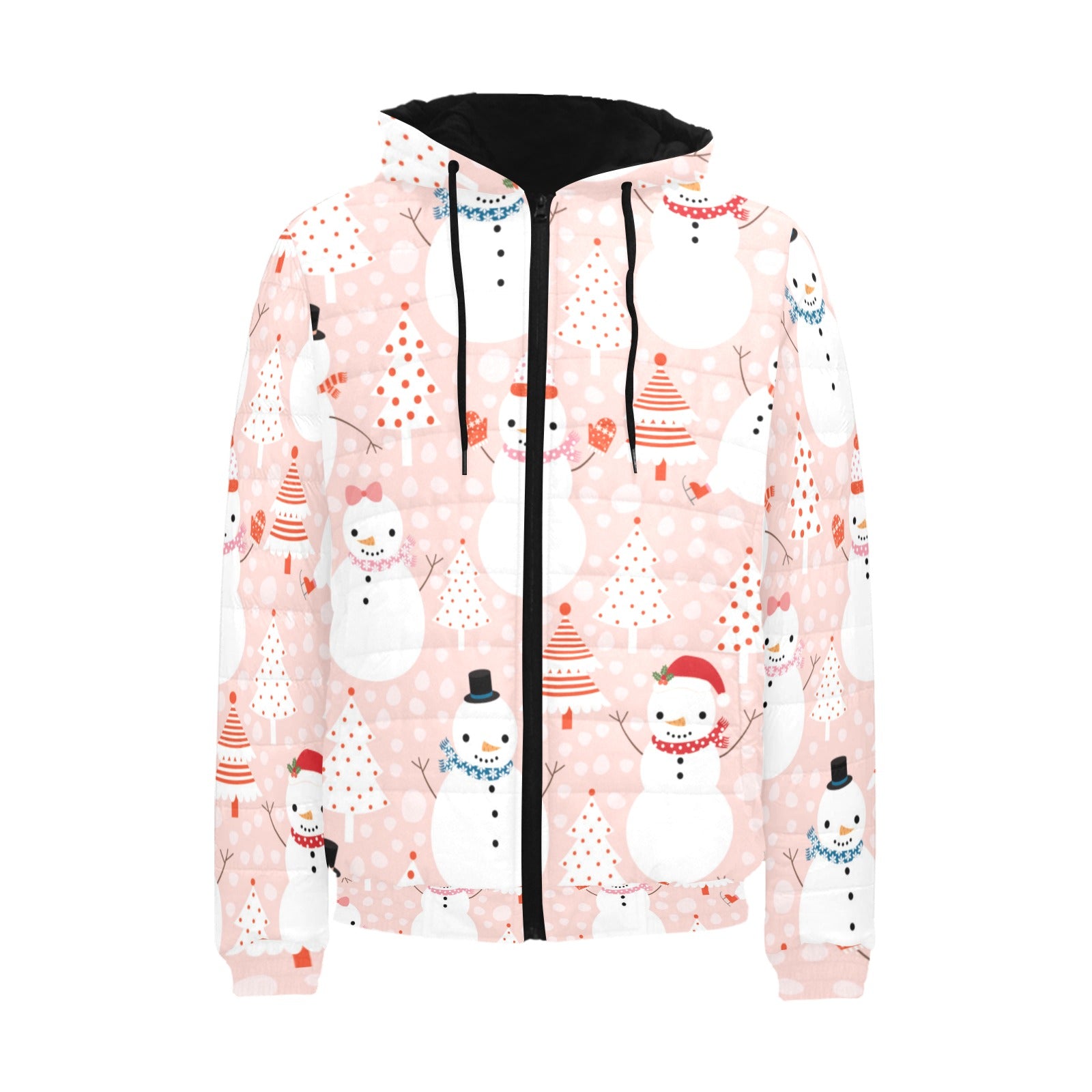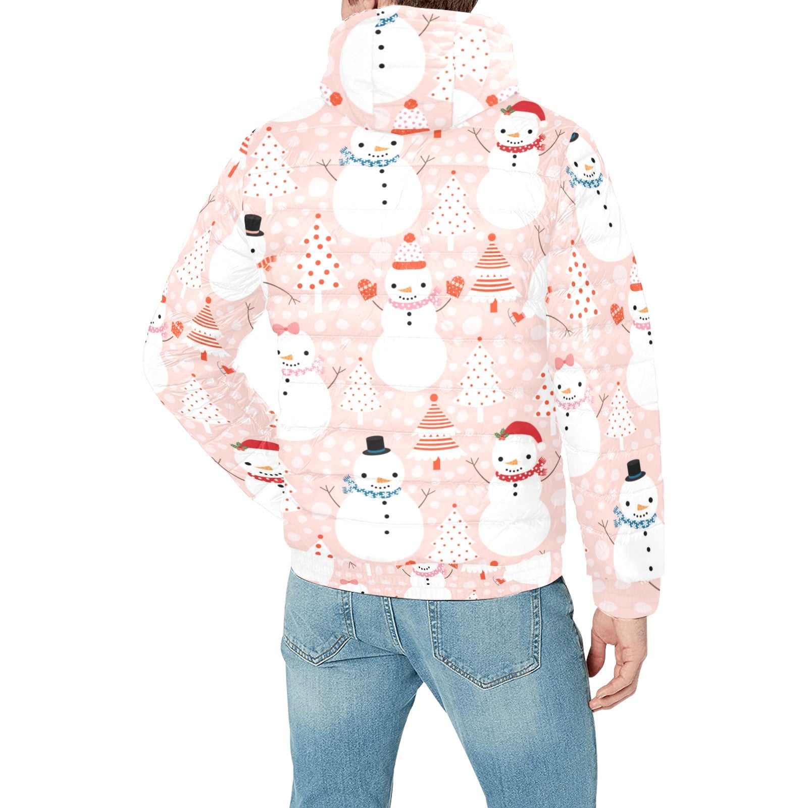 Cute snowman christmas tree snowpink background Men's Padded Hooded Jacket